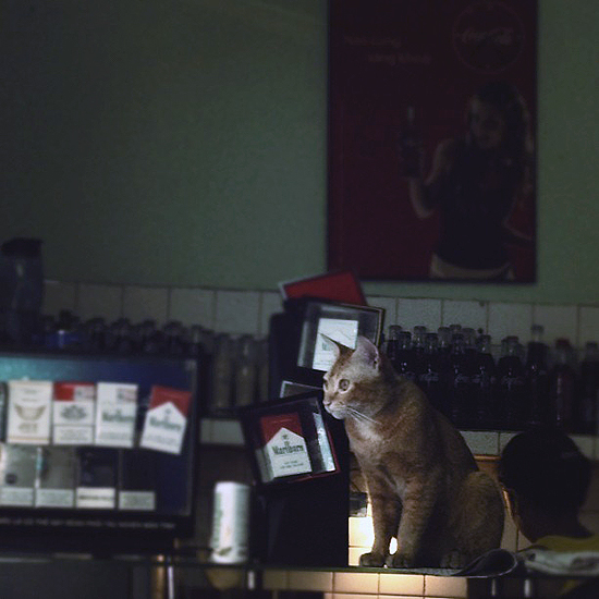 Image three description: The couple holding their two cats as they smile softly at each other.]⁠