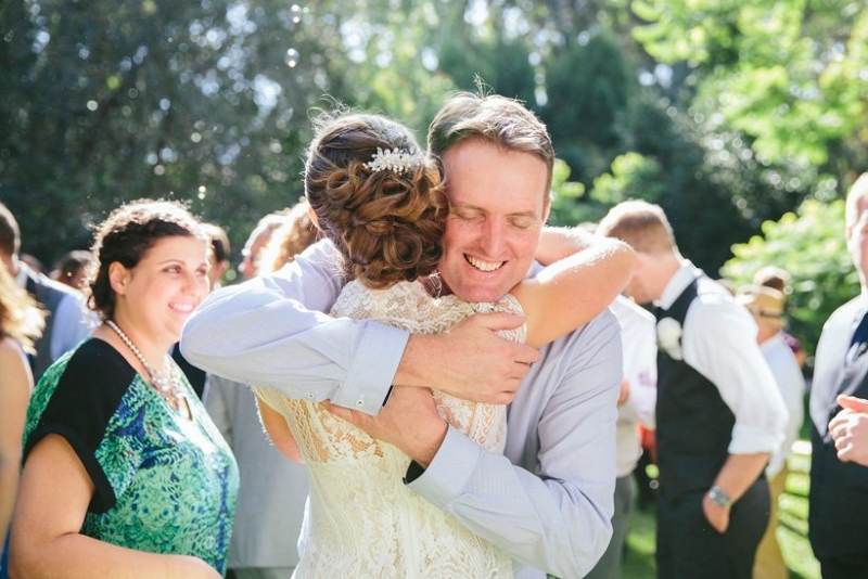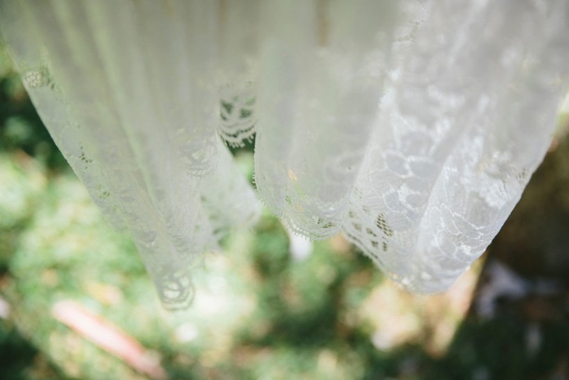 Mindful consumption denotes this pair who borrowed what they could from bridesmaid jewellery to flower jugs, crafted chairs out of pallets (made by Tim) and reused the floral arrangements for both ceremony and reception (easy to do when all at the same venue). Dinner was pizza served simply with bamboo plates and cutlery under fairy lights in the garden, followed by homemade desserts and organic tea/fair trade coffee. Anna’s dainty Lover dress was made from offcuts of antique French lace as part of a sale special, and their rings were re-made from family jewellery.