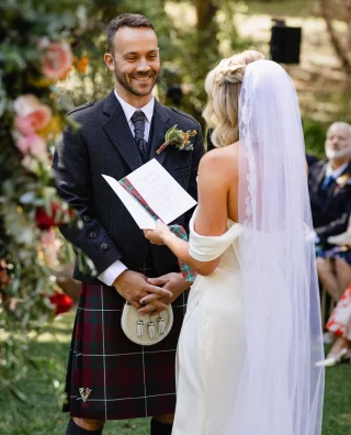 [Image one description: A groom dressed in traditional Scottish attire, including a tartan kilt, smiles warmly as he stands opposite his bride. The bride, wearing an off-the-shoulder ivory gown and long veil, holds her vows wrapped with a piece of tartan fabric.⁠