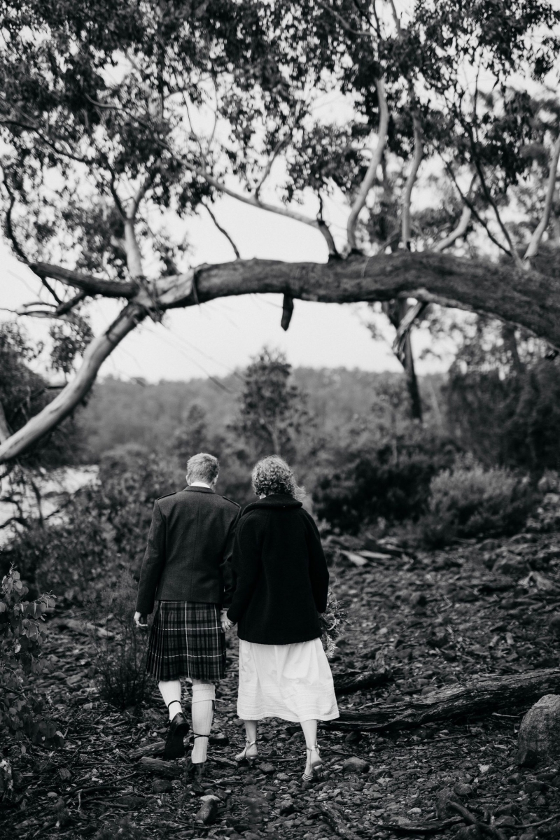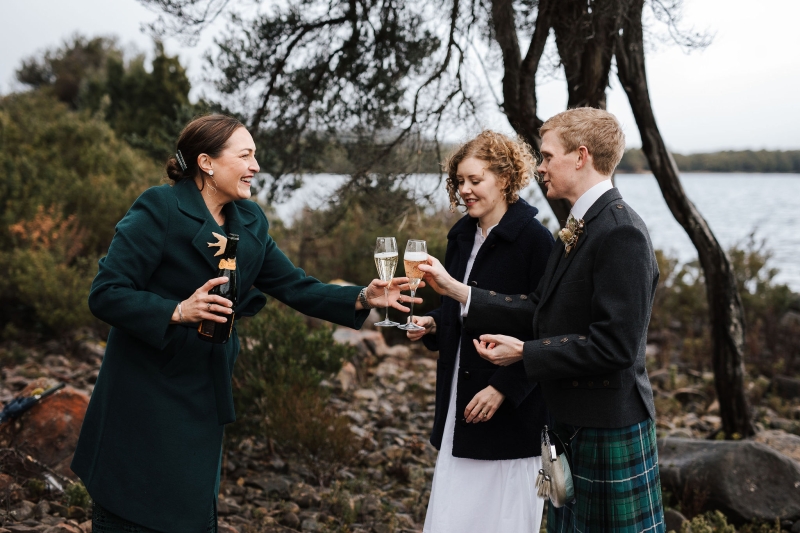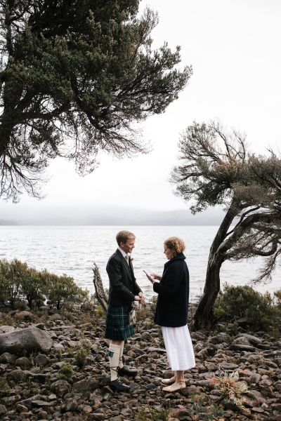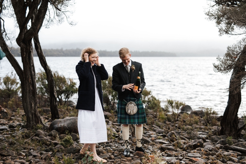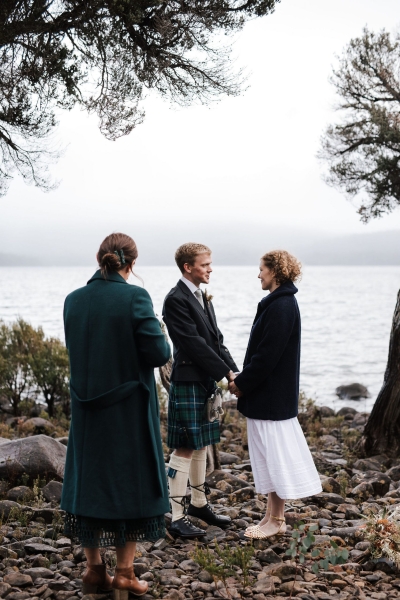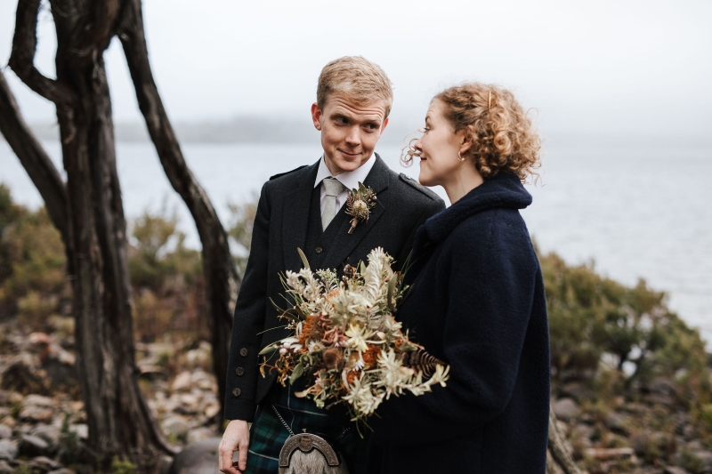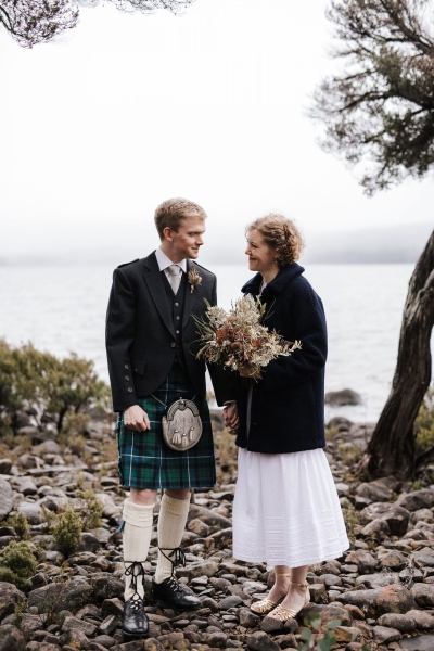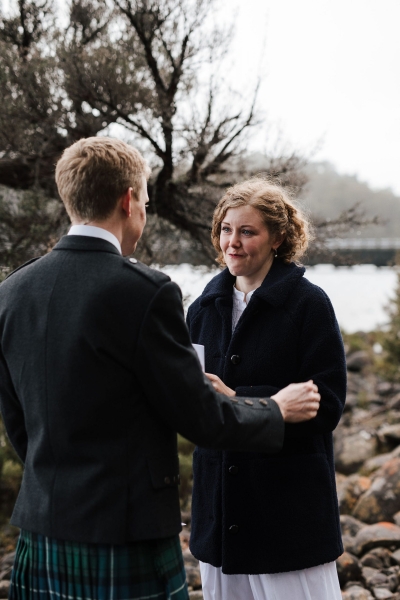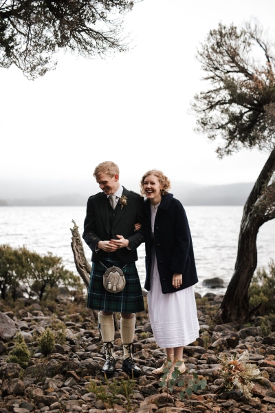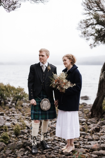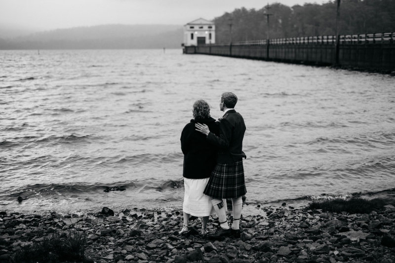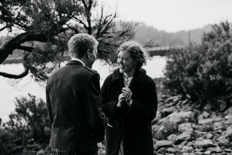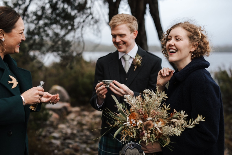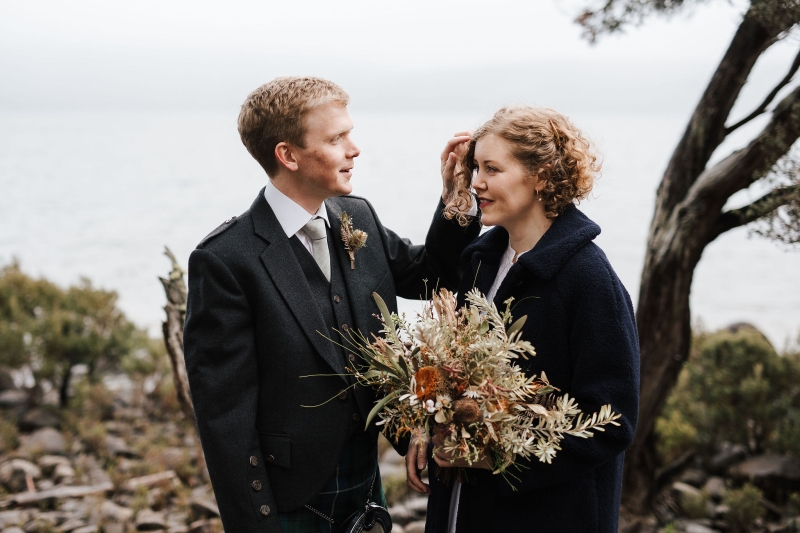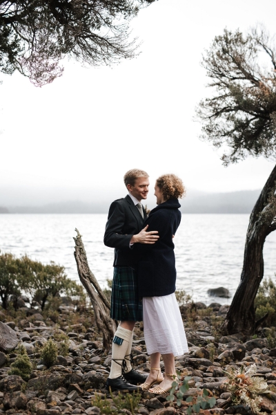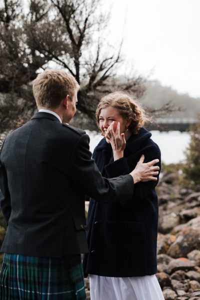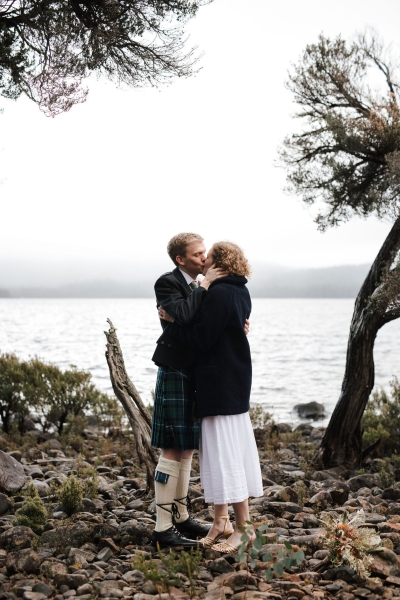 Standing on freezing the shores of leawuleena (palawa for ‘Sleeping Water’) with only the photographer and a hotel staff member as witnesses, Michael donned his family tartan, and Emma stubbornly wore the dress she planned for the summer wedding they had hoped for. They laughed and cried, exchanged the most perfect vows, and shared warming Tasmanian whisky from a traditional Scottish Quaich or “friendship cup” before finally being declared husband and wife.