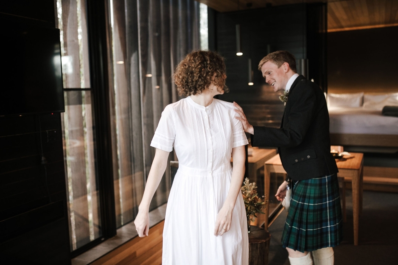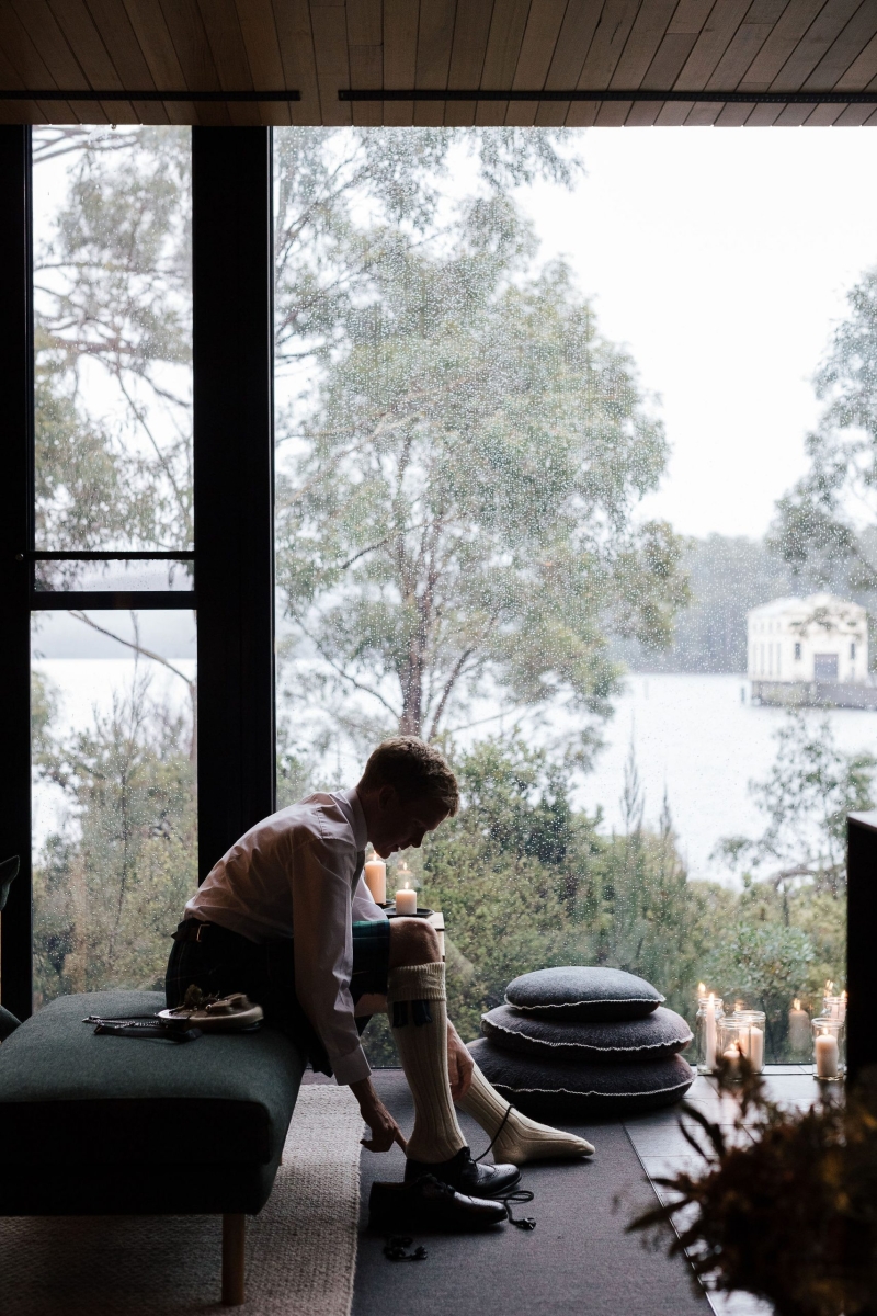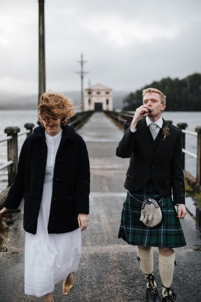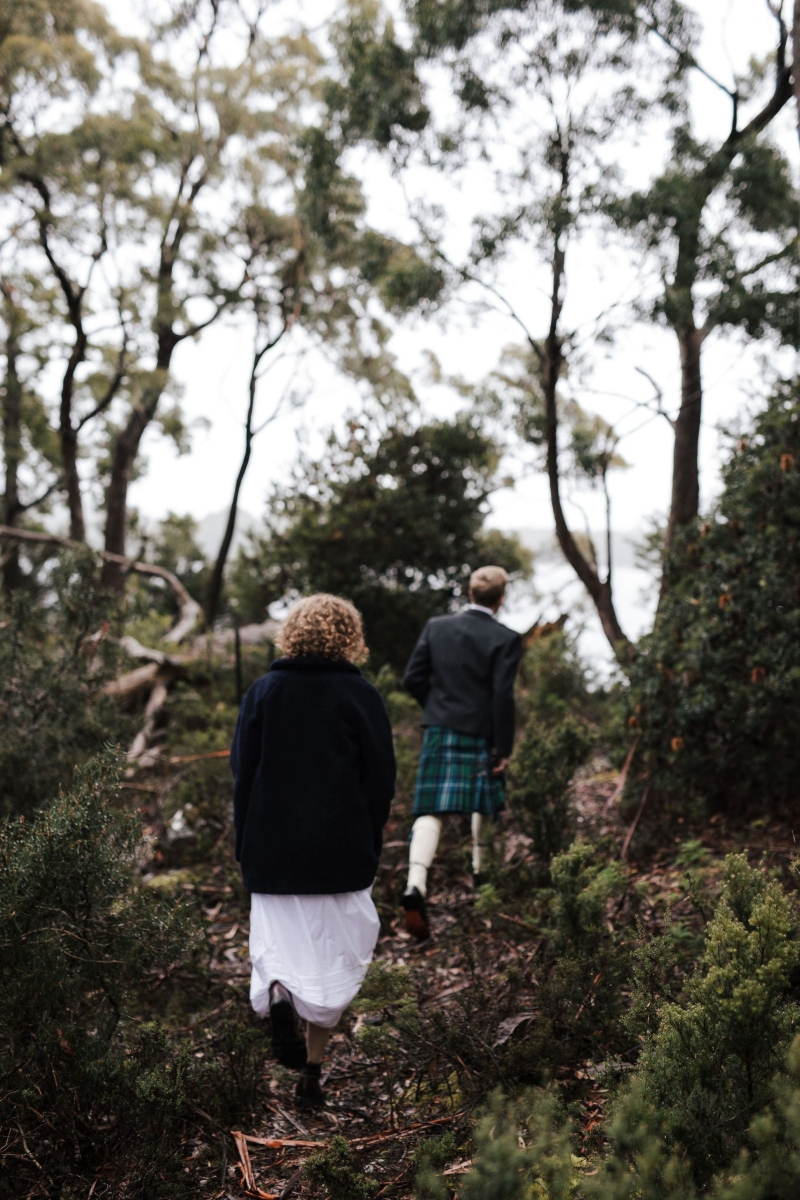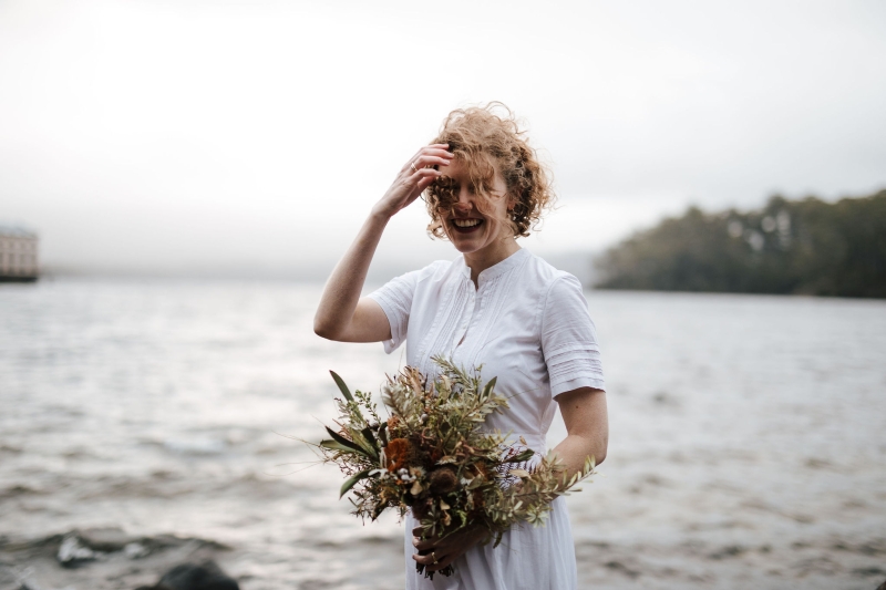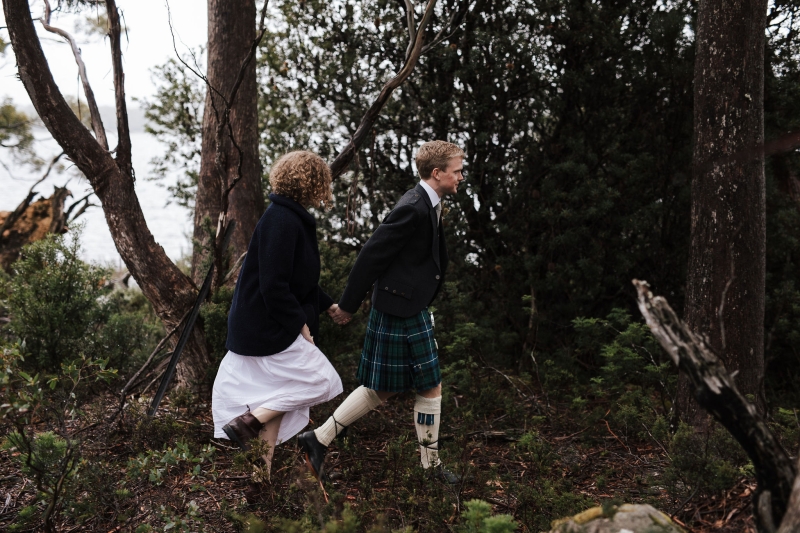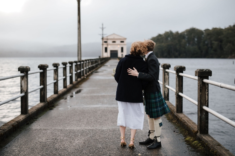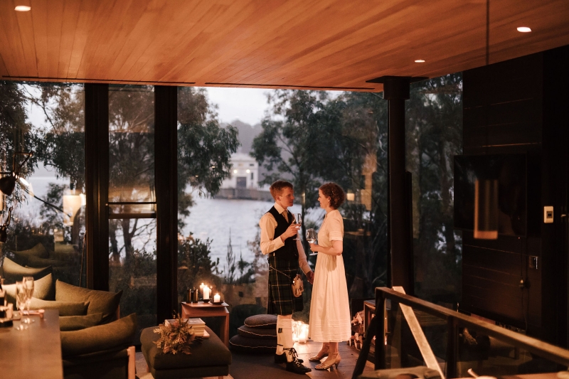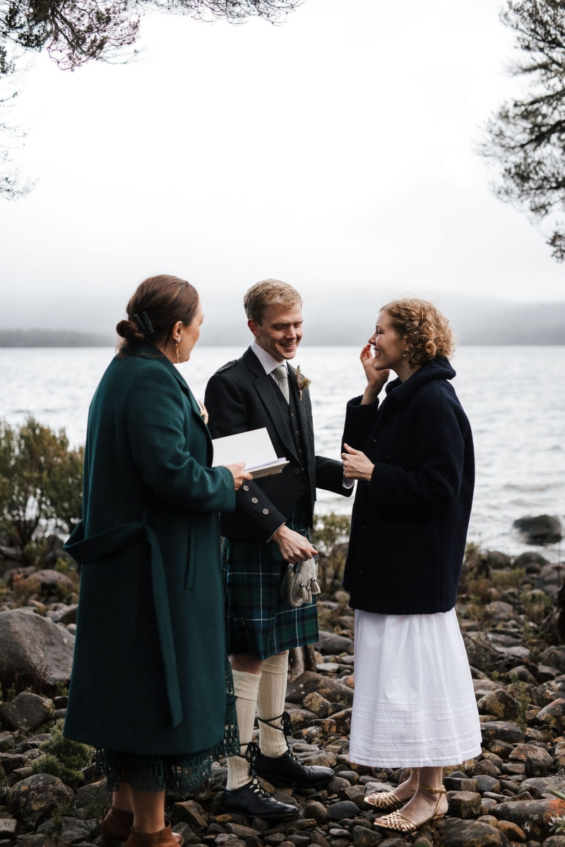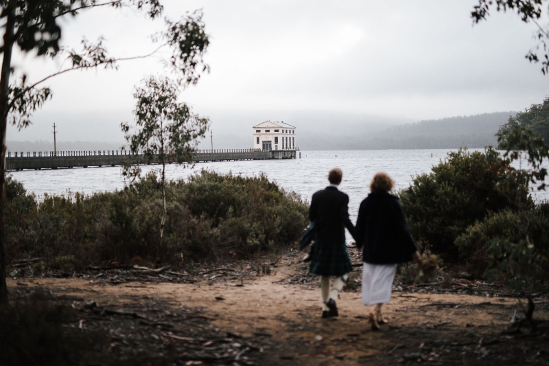 Standing on freezing the shores of leawuleena (palawa for ‘Sleeping Water’) with only the photographer and a hotel staff member as witnesses, Michael donned his family tartan, and Emma stubbornly wore the dress she planned for the summer wedding they had hoped for. They laughed and cried, exchanged the most perfect vows, and shared warming Tasmanian whisky from a traditional Scottish Quaich or “friendship cup” before finally being declared husband and wife.
