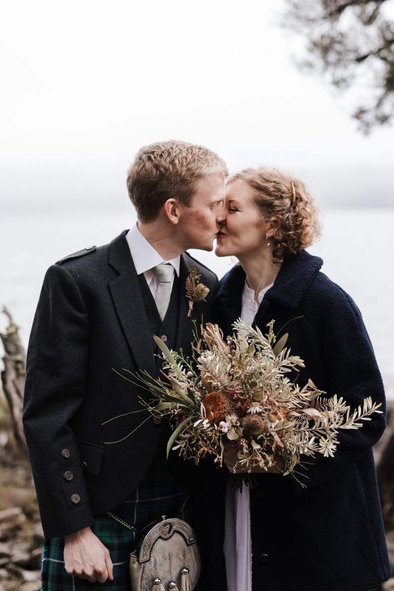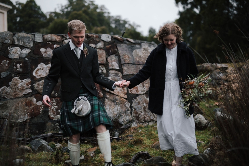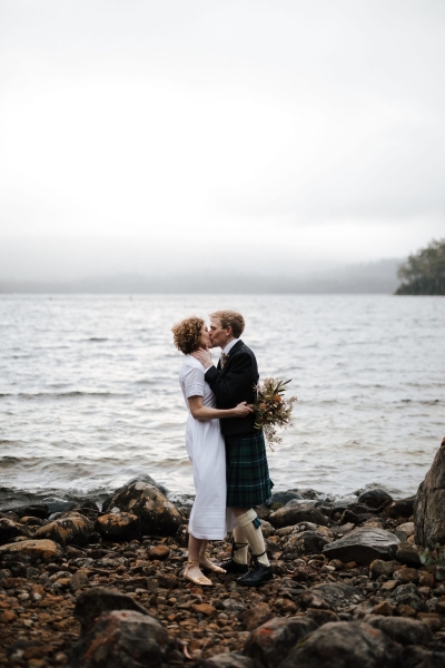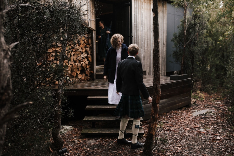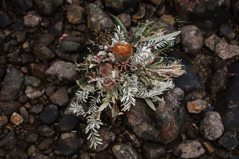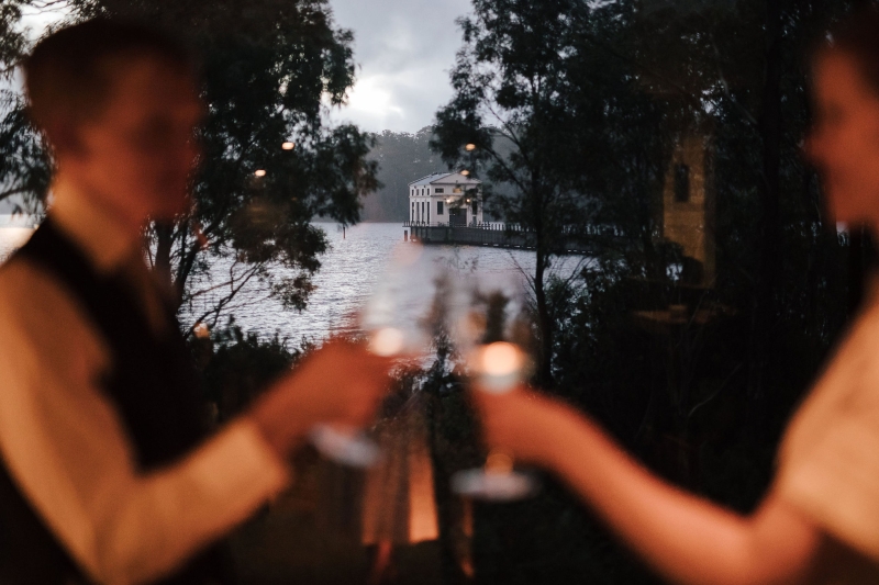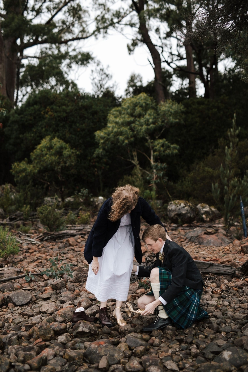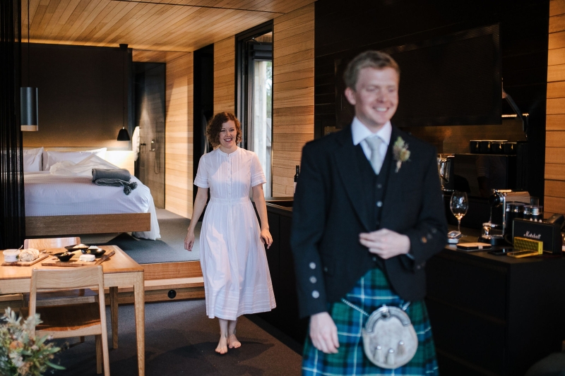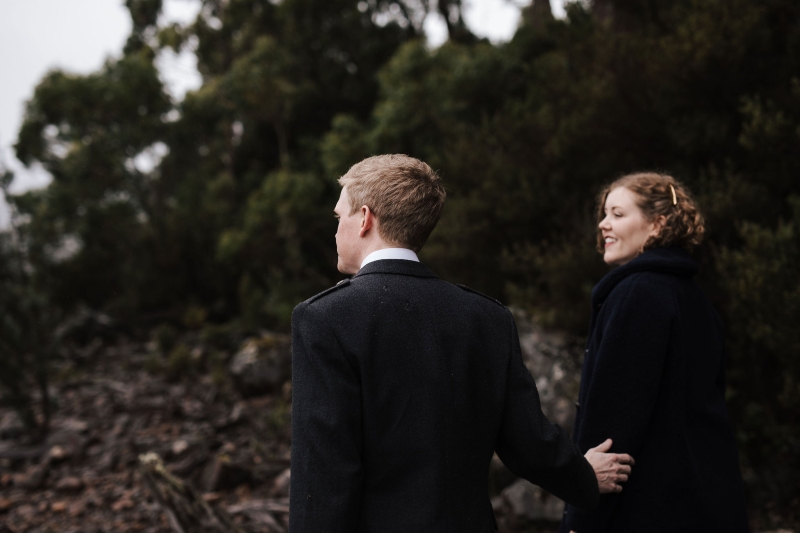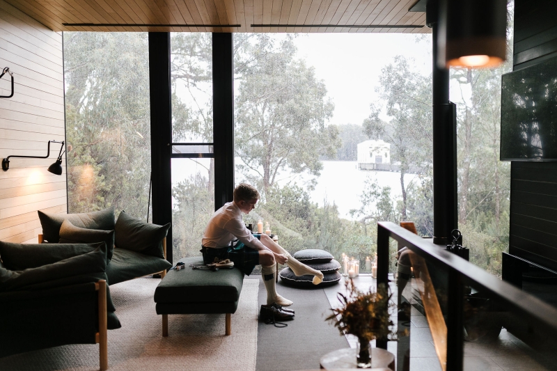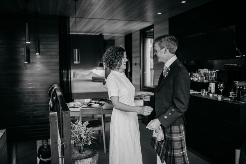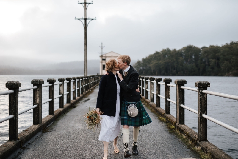 Standing on freezing the shores of leawuleena (palawa for ‘Sleeping Water’) with only the photographer and a hotel staff member as witnesses, Michael donned his family tartan, and Emma stubbornly wore the dress she planned for the summer wedding they had hoped for. They laughed and cried, exchanged the most perfect vows, and shared warming Tasmanian whisky from a traditional Scottish Quaich or “friendship cup” before finally being declared husband and wife.