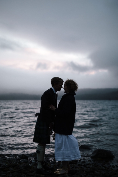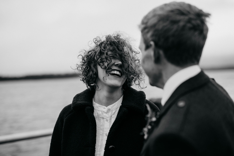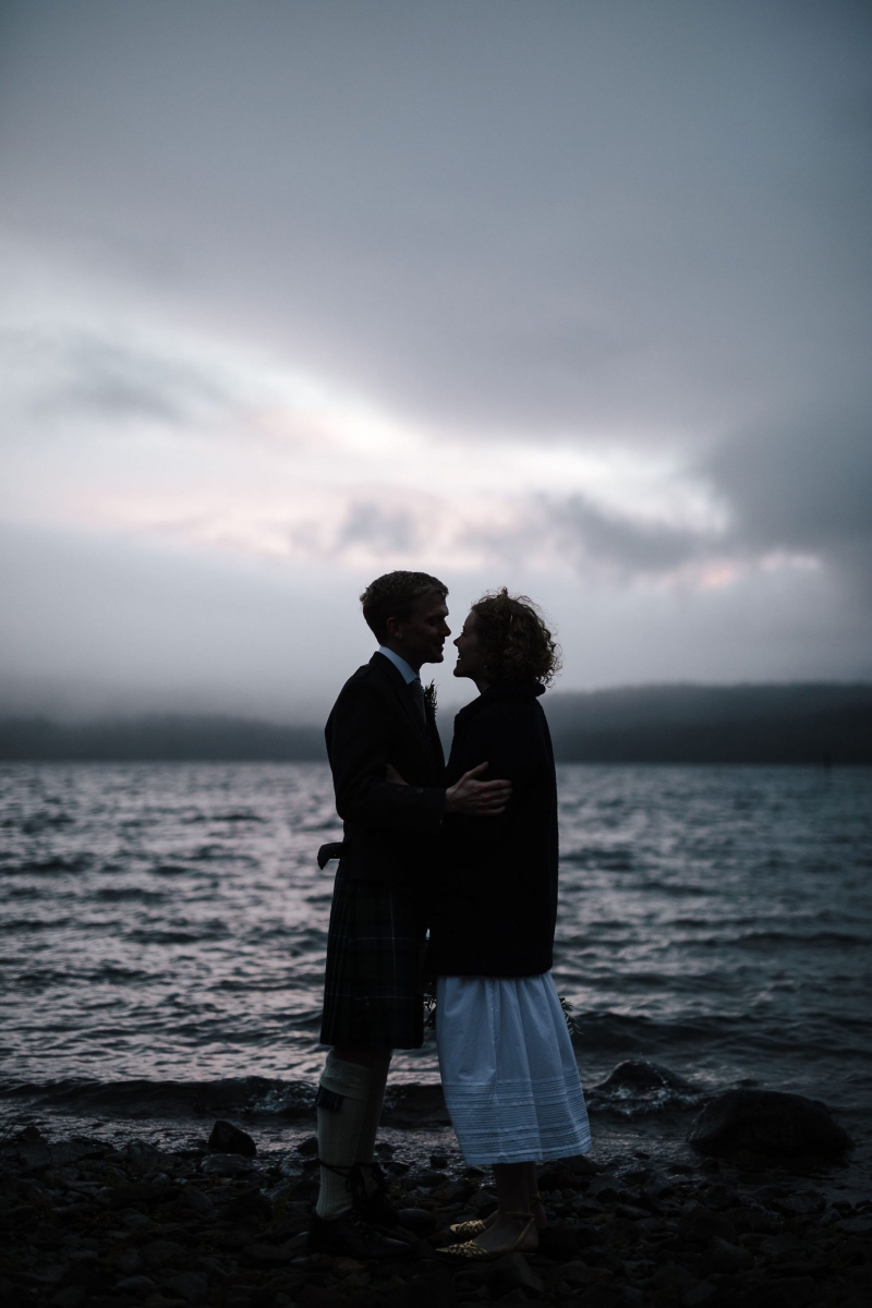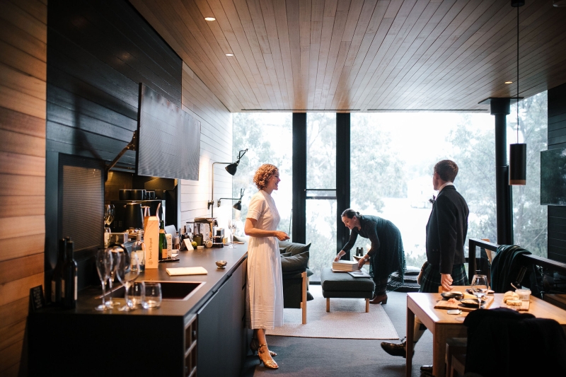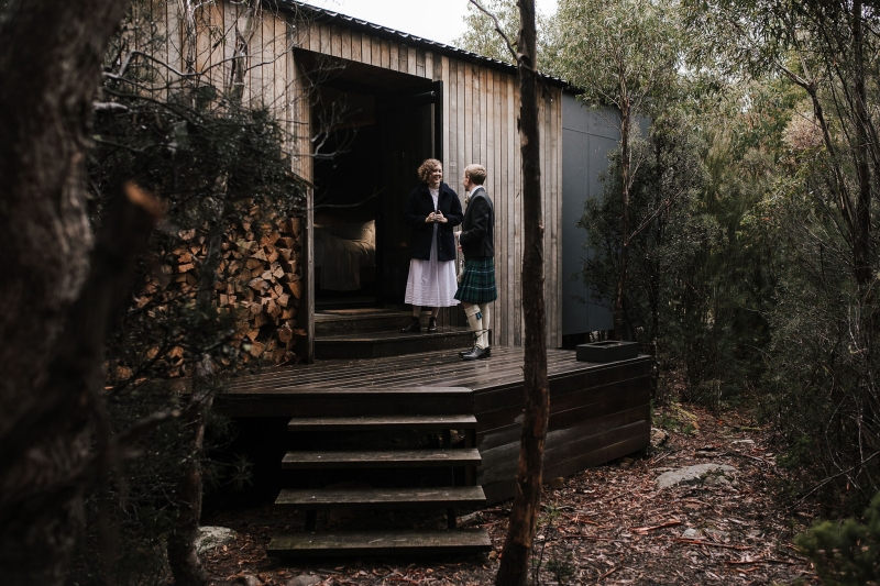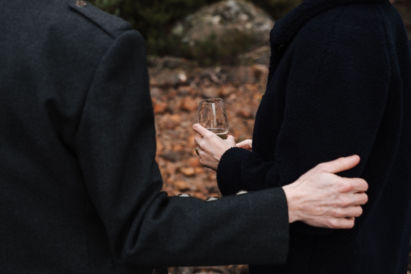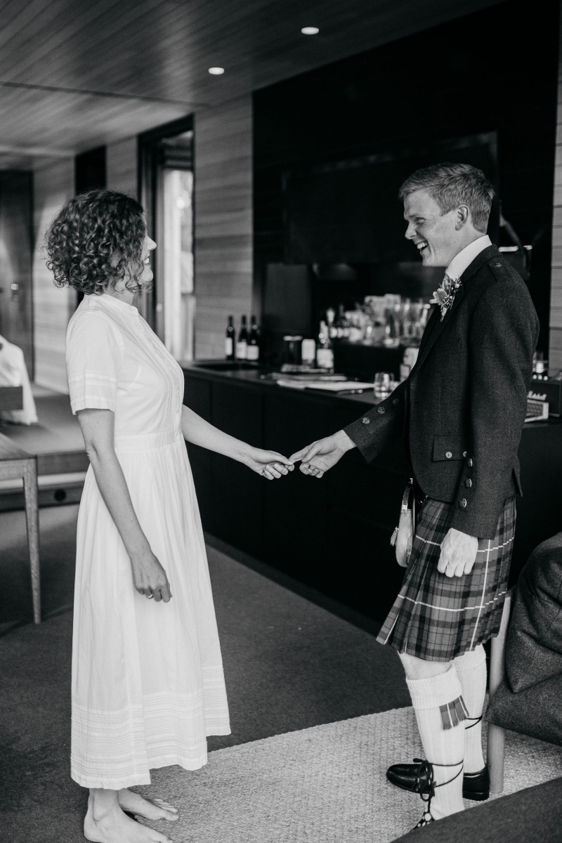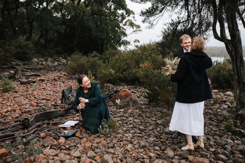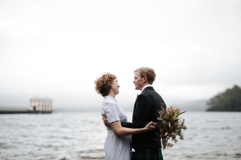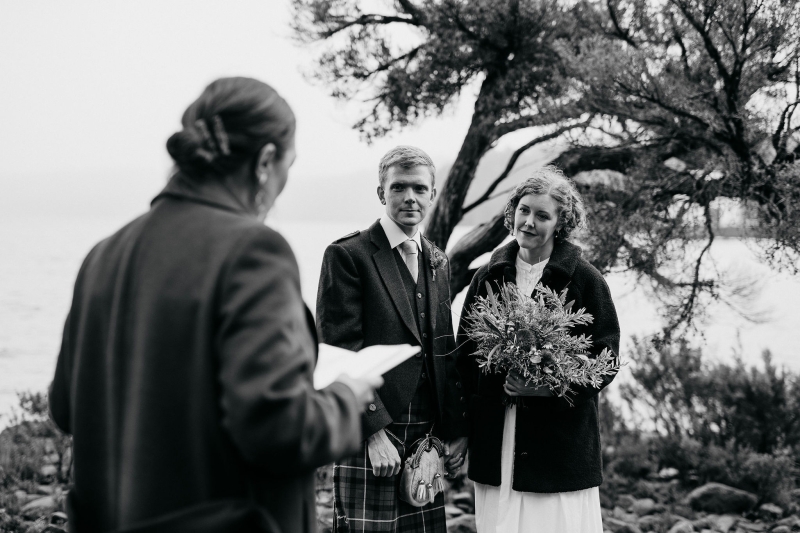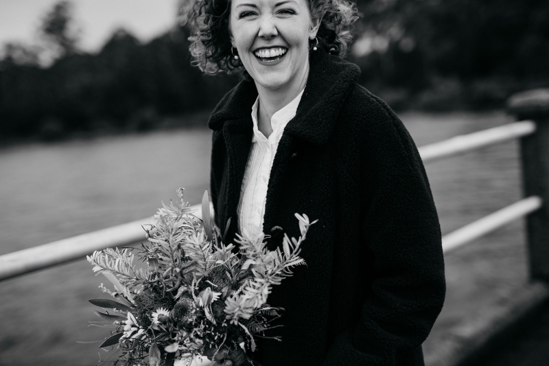 Standing on freezing the shores of leawuleena (palawa for ‘Sleeping Water’) with only the photographer and a hotel staff member as witnesses, Michael donned his family tartan, and Emma stubbornly wore the dress she planned for the summer wedding they had hoped for. They laughed and cried, exchanged the most perfect vows, and shared warming Tasmanian whisky from a traditional Scottish Quaich or “friendship cup” before finally being declared husband and wife.