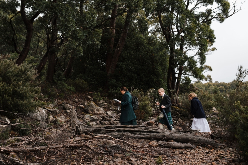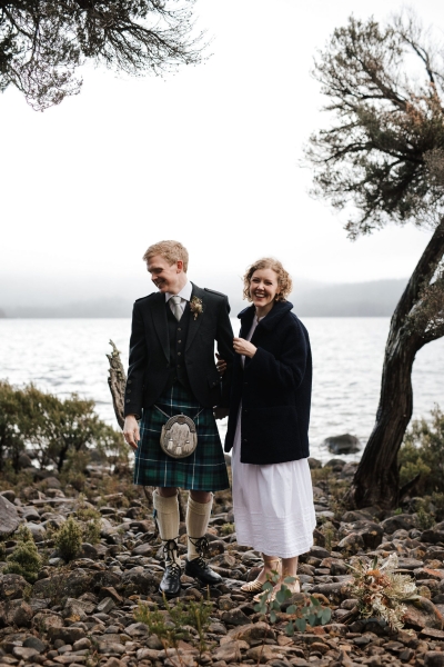 Michael and Emma only ever wanted an intimate wedding. Initial plans were for Scottish-born Michael, and Melbourne girl Emma to fly with a handful of family and friends to the remote wilderness of lutruwita/Tasmania and spend a few nights together exploring beautiful Lake St Clair and its breathtaking surrounding forest.