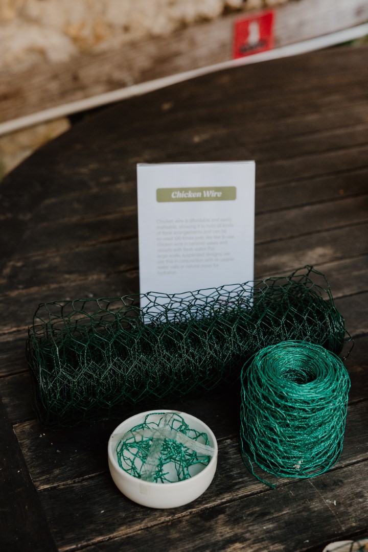 Chicken wire is affordable and easily malleable, allowing it to hold to all kinds of floral arrangements and can be re-used 100 times over. We like to use chicken wire in ceramic vases and vessels with fresh water. For large-scale, suspended designs, we use this in conjunction with re-usable water vials or natural moss for hydration.