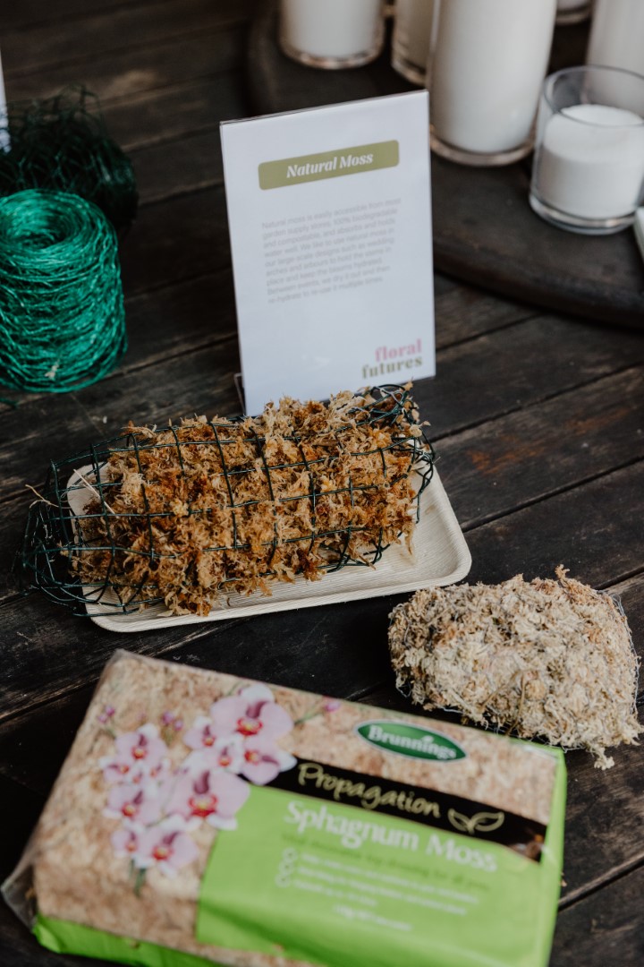 Natural moss is easily accessible from most garden supply stores, 100% biodegradable and compostable, and absorbs and holds water well. We like to use natural moss in our large-scale designs such as wedding arches and arbours to hold the stems in place and keep the blooms hydrated. Between events, we dry it out and then re-hydrate to re-use it multiple times.