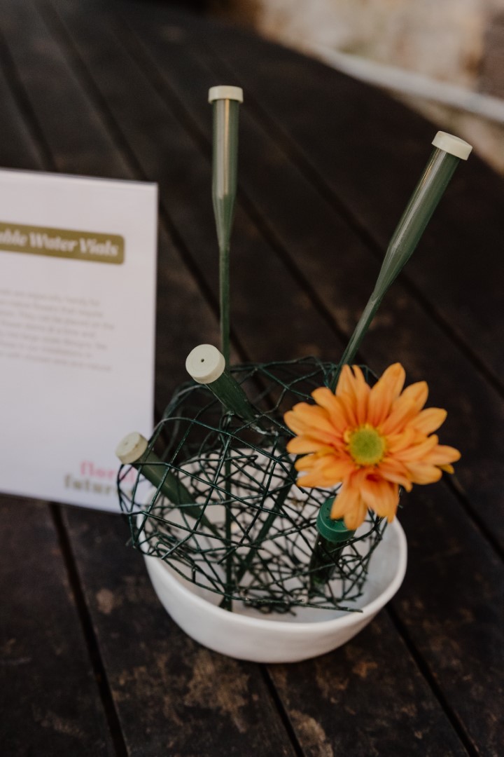 At the Floral Futures event, we had a table that displayed all the safe and sustainable alternatives to floral foam. Guests were able to play with the product and arrange flowers using each tool.