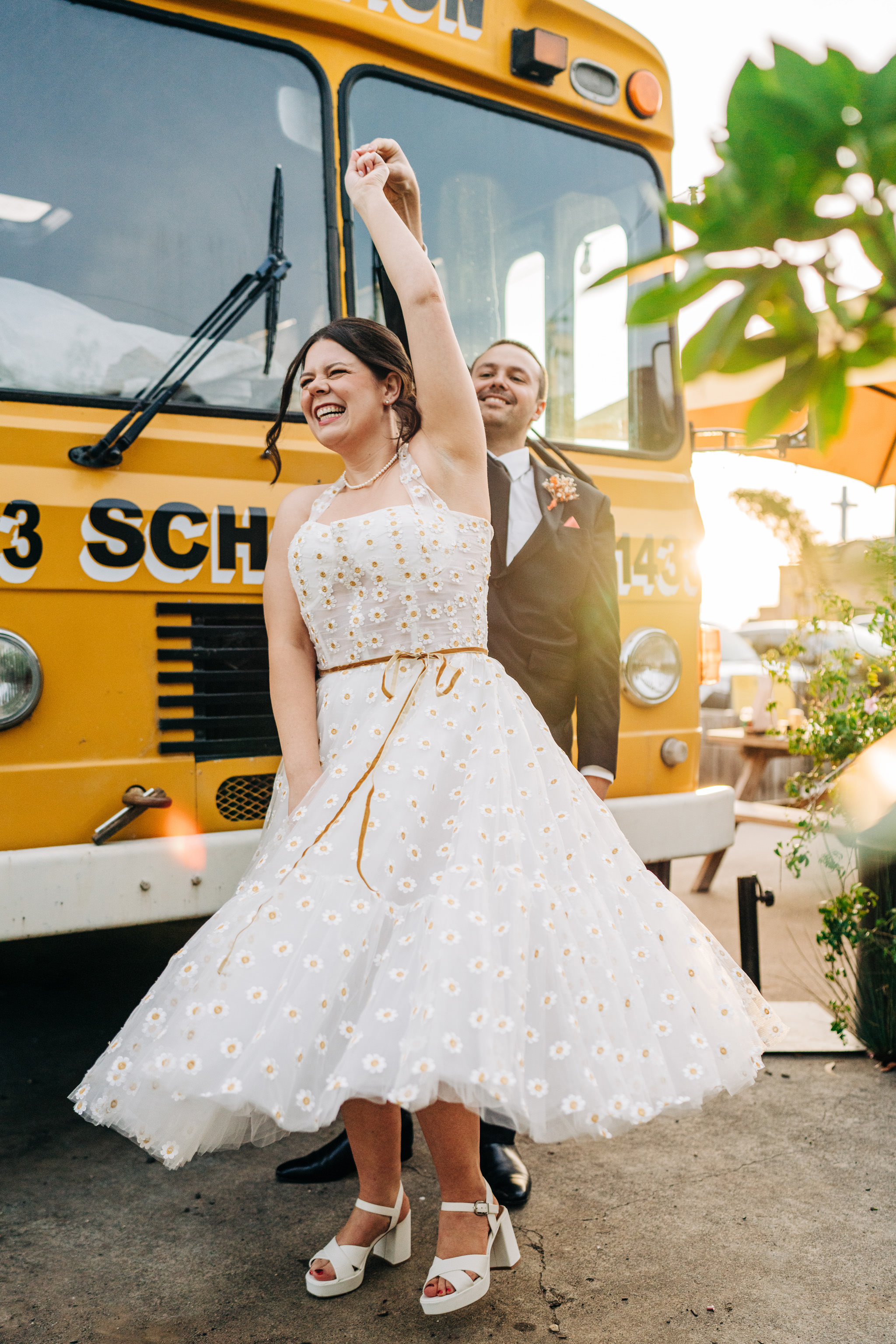 [Image one description: Two brides stand close together, smiling with their arms wrapped around each other. One wears a short white bridal gown with a long veil. The other wears a sleeveless, gold-and-silver sequin dress. They are posed in front of a bold, leafy, patterned wallpaper.⁠