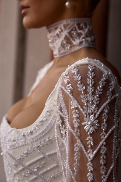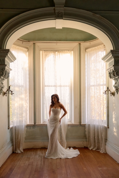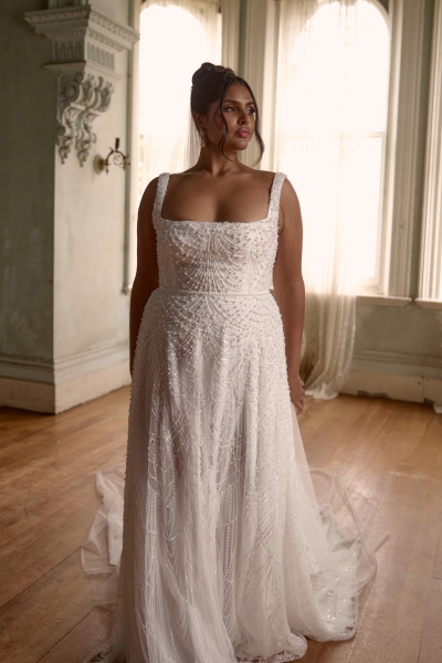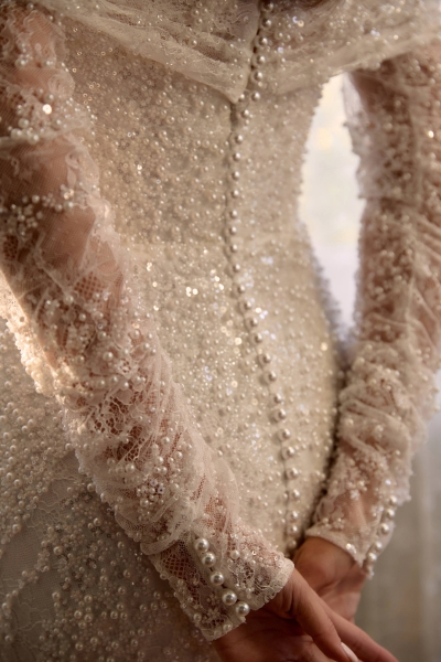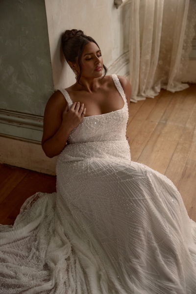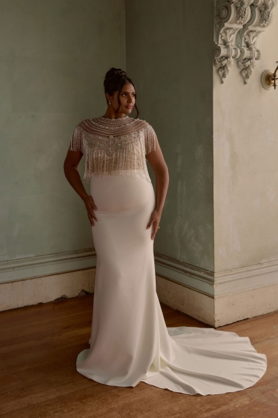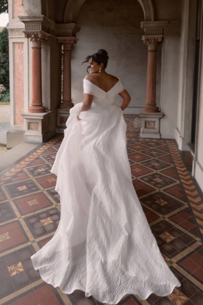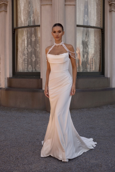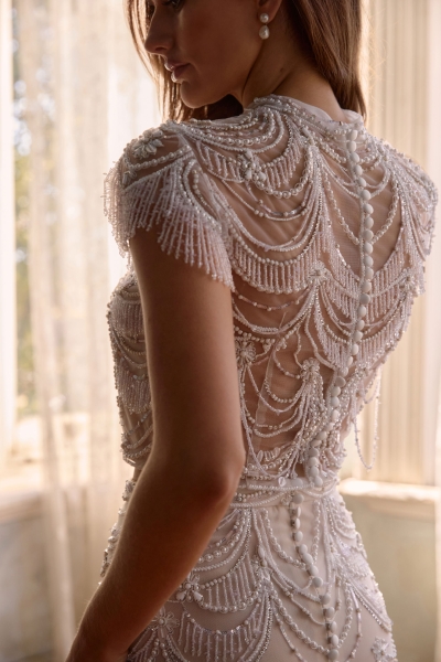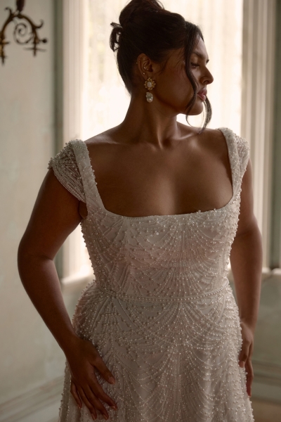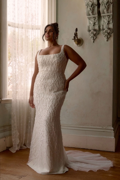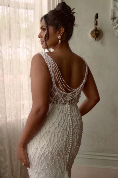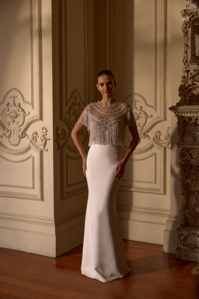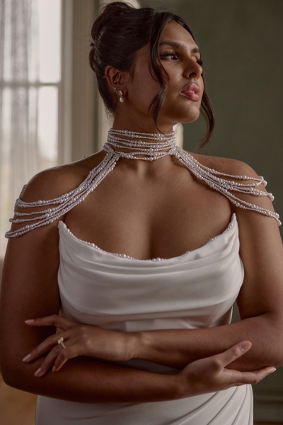 Standout styles from the collection include Alaska, featuring a voluminous Mikado gown, hand-embellished floral waist, and sculpted bodice. Cassandra, with her sleek crepe silhouette, is adorned with delicate pearl trimmings. And Riviera, a hand-beaded showstopper with a jaw-dropping neckline and statement pearl drape.