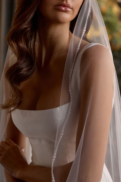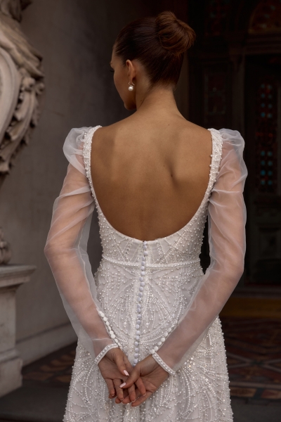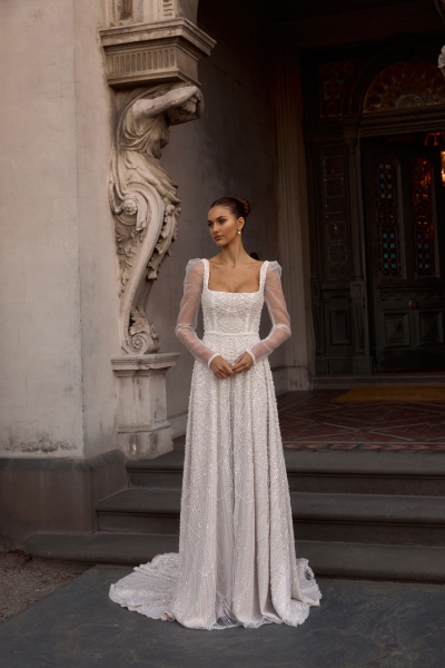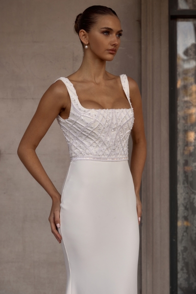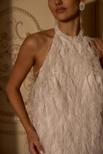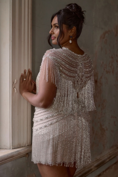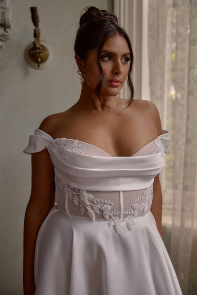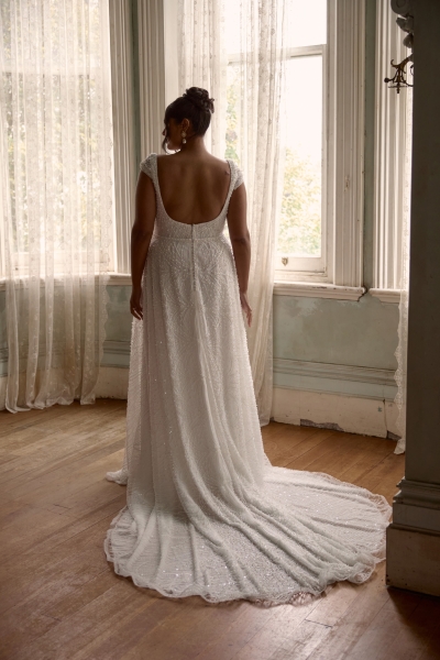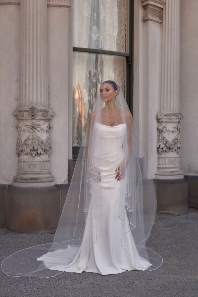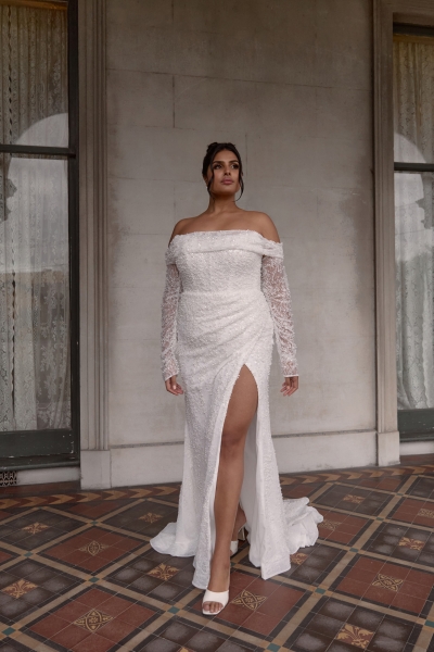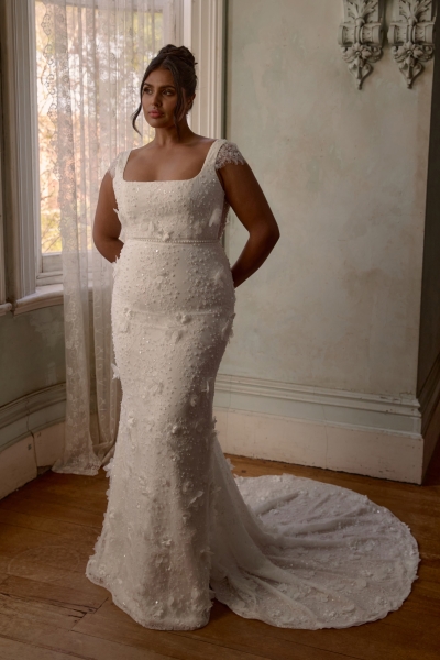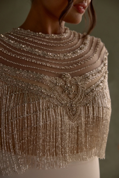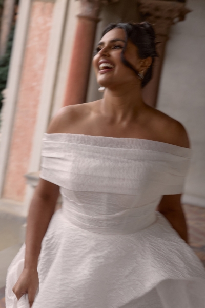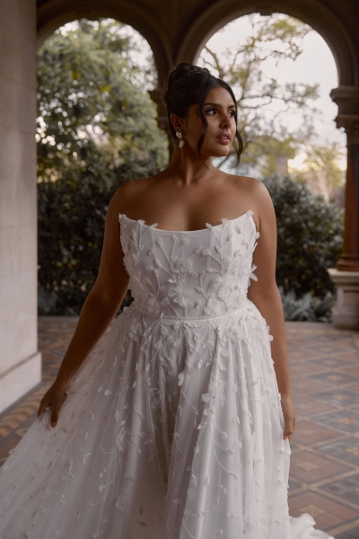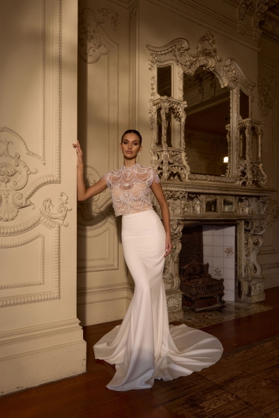 Standout styles from the collection include Alaska, featuring a voluminous Mikado gown, hand-embellished floral waist, and sculpted bodice. Cassandra, with her sleek crepe silhouette, is adorned with delicate pearl trimmings. And Riviera, a hand-beaded showstopper with a jaw-dropping neckline and statement pearl drape.