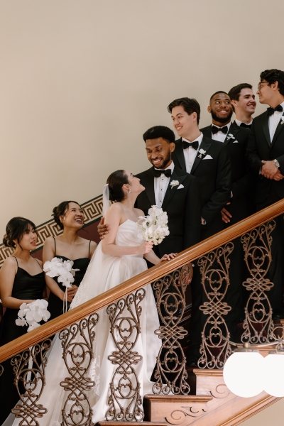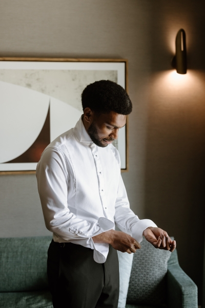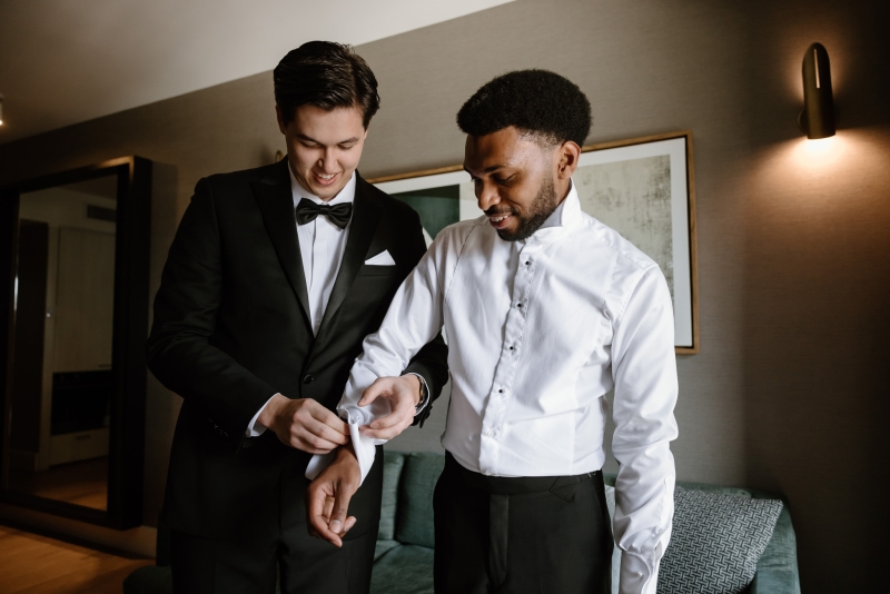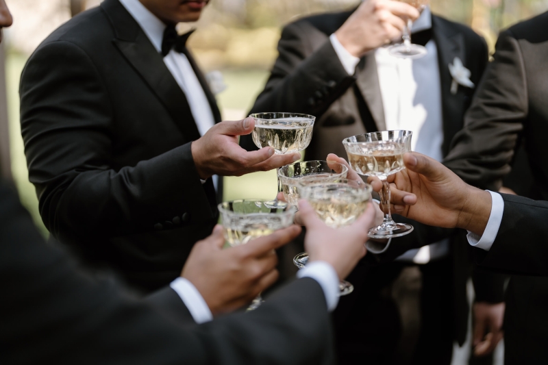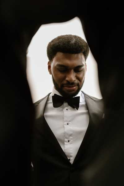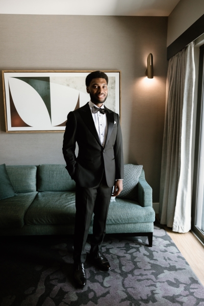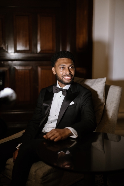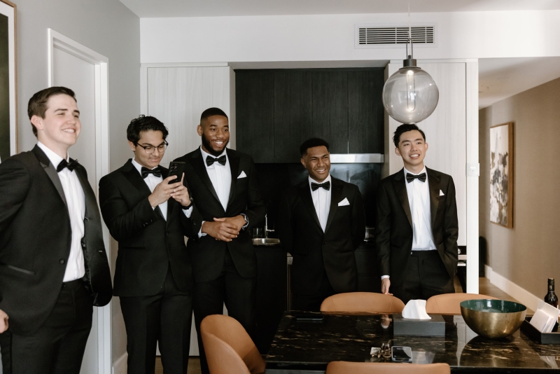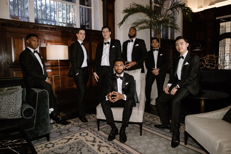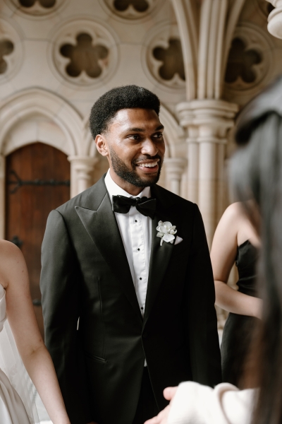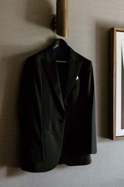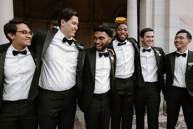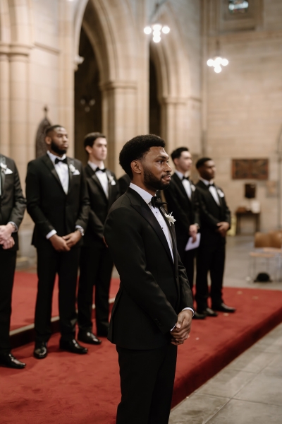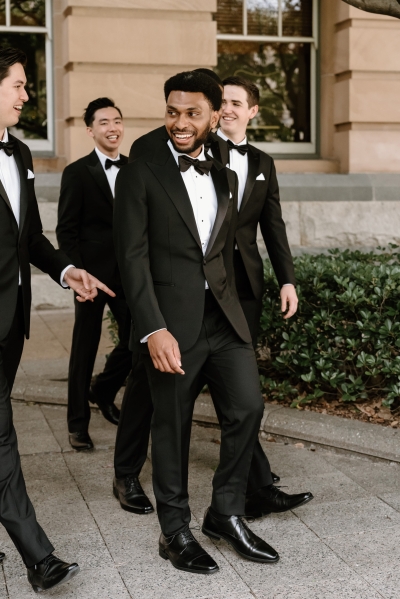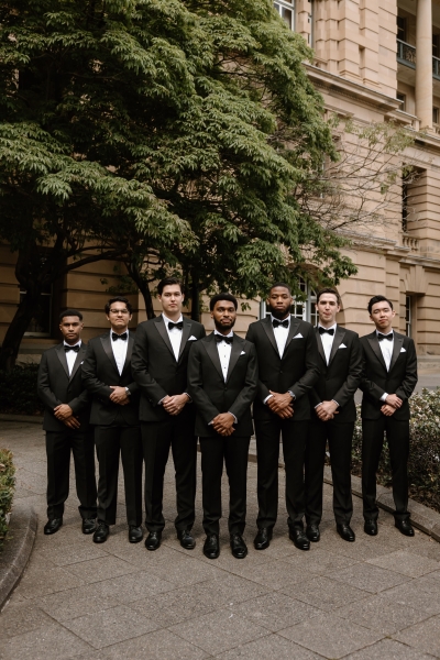 Andre wore a black made-to-measure tuxedo from The Cloakroom, with fabric sourced from Japan. “The process of designing and then tailoring the suit with their director, Andrew, was incredible! We were initially unsure whether we wanted to go custom, but after a fitting with their team, it really felt like there was no better option,” Sionnan explained. “The Groomsmen hired tuxedos similar to Andre’s from Tony Barlow, they all went in to the fitting together and had a great time!”