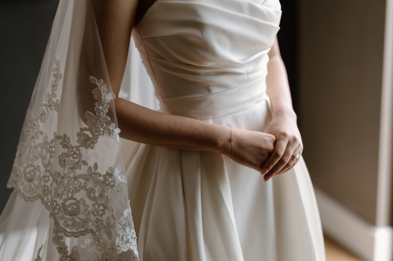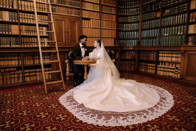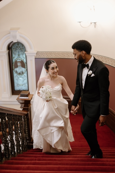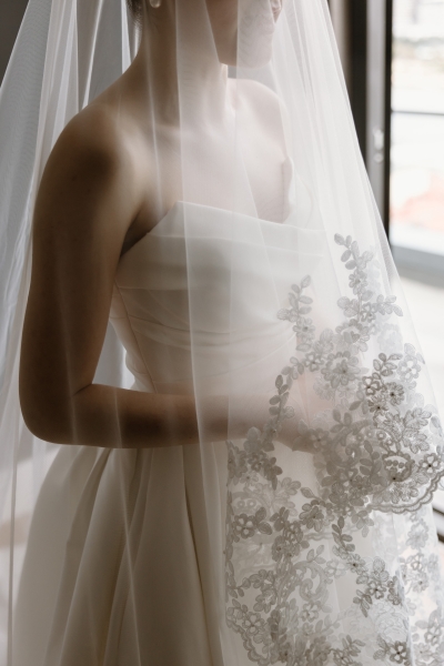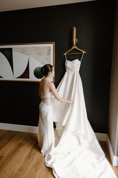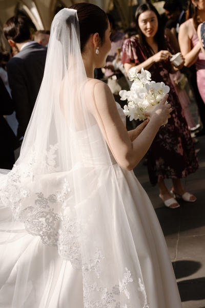For the ceremony, Sionnan wore a beautiful strapless Milla Nova gown, with an incredible Steven Khalil veil. “I wanted a classic, timeless feel across each look with a subtle continuity between each dress, whilst still having a strong contrast to match the setting of each moment. I shopped at Luv Bridal for my ceremony gown, and their team was wonderful – a shout-out to my maid of honour and bridesmaids for helping the most indecisive bride! Also, Sheena from the fitting room on Edward, who did all of my alterations and got the fit of each dress to perfection.”