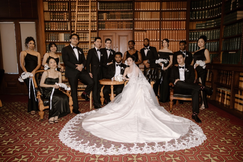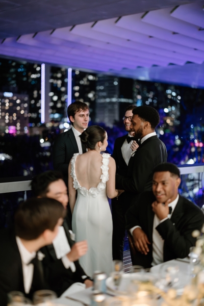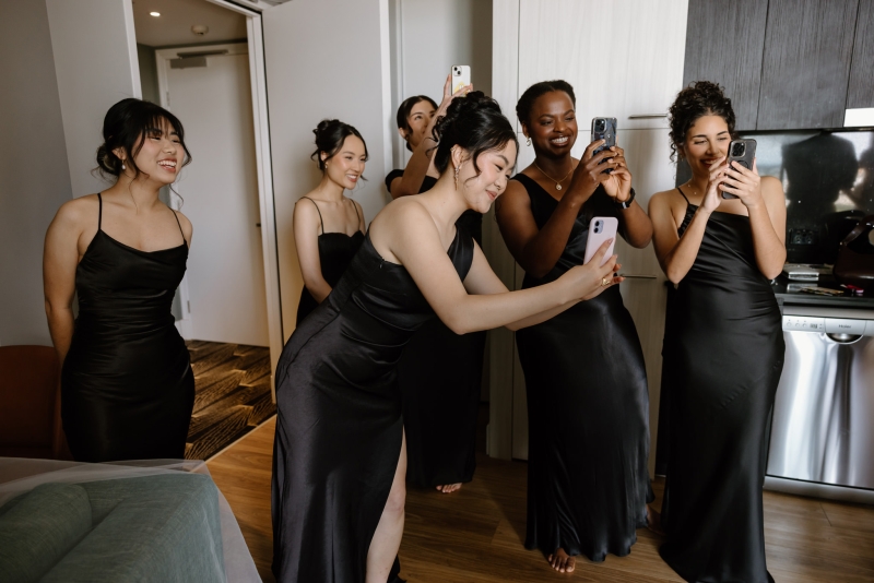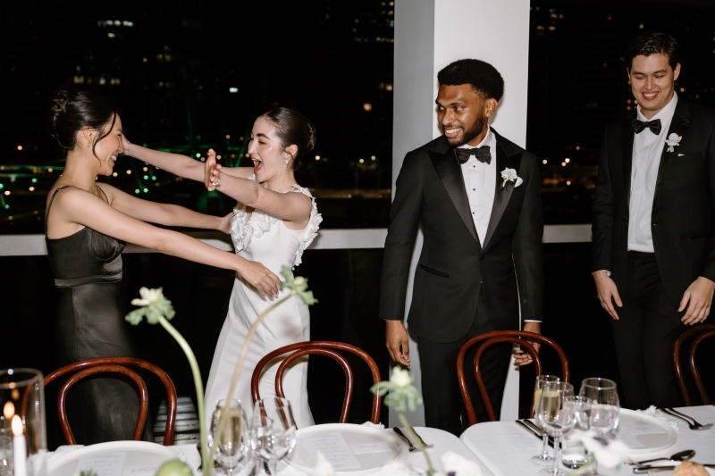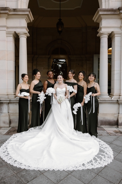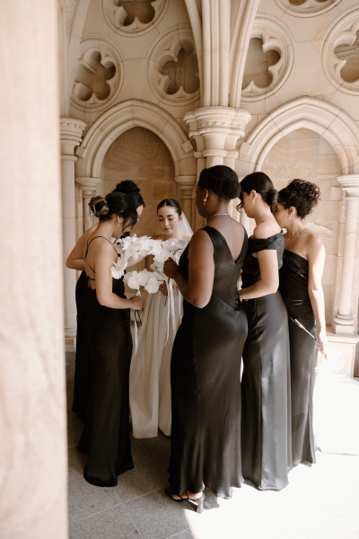 Her wedding party wore a mixture of black satin dresses from Shona Joy and Bec + Bridge, matching the modern classic vibes of the day.