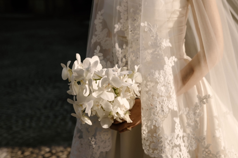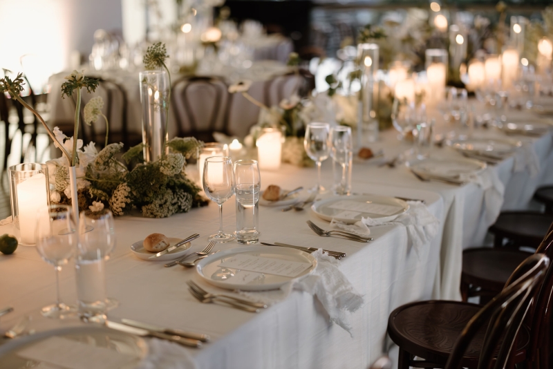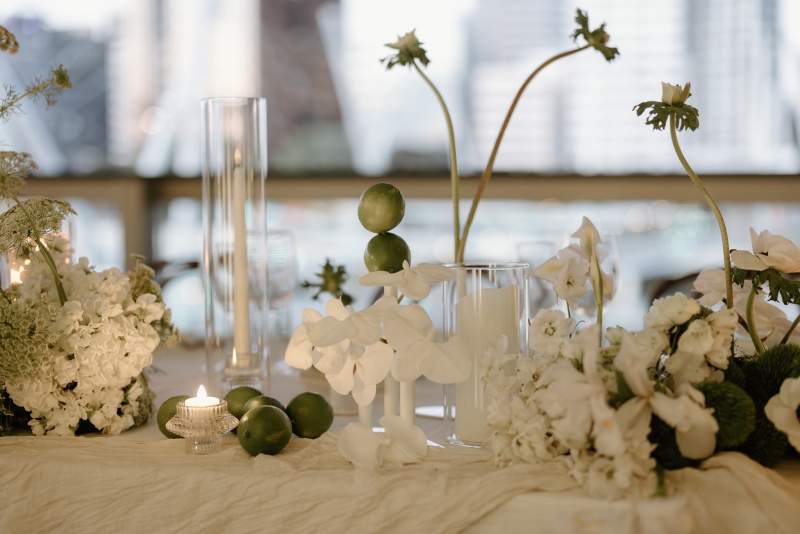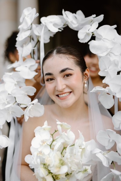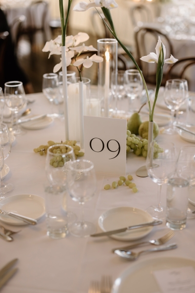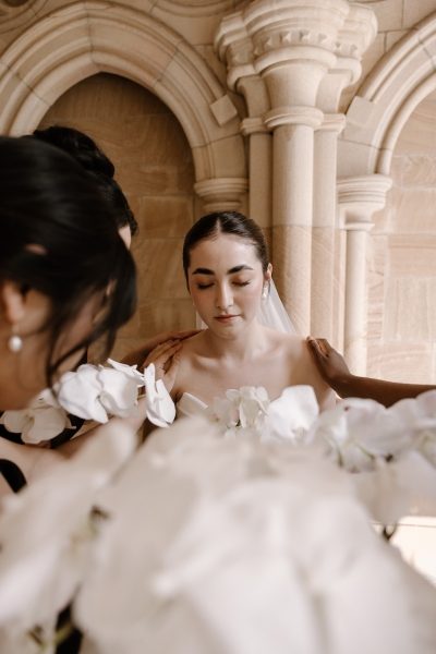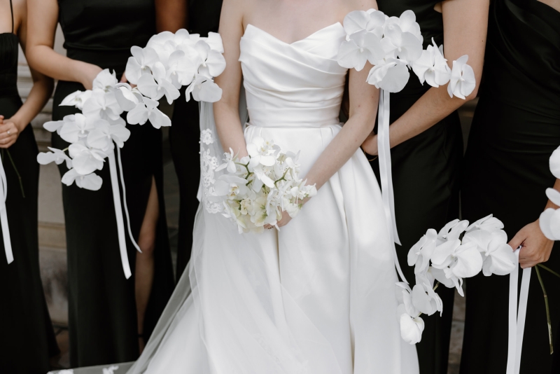 As Andre had spent his early childhood in Papua New Guinea, Sionnan wanted to include a tribute to that part of his life in their wedding. Orchids are one of the things he remembers most clearly about that time, so it was the perfect choice of flower to litter throughout the day. “Working with Bloodwood Botanica, we centred the floral theme on a white orchid, with the bouquets all being orchids, along with the boutonnières. We then had cascading orchids on our wedding cake and a range of white and greenery across our reception venue, also featuring some fruit. We wanted the orchids to feel classic but transition into the reception venue with a modern twist, with some artistic flair.”
