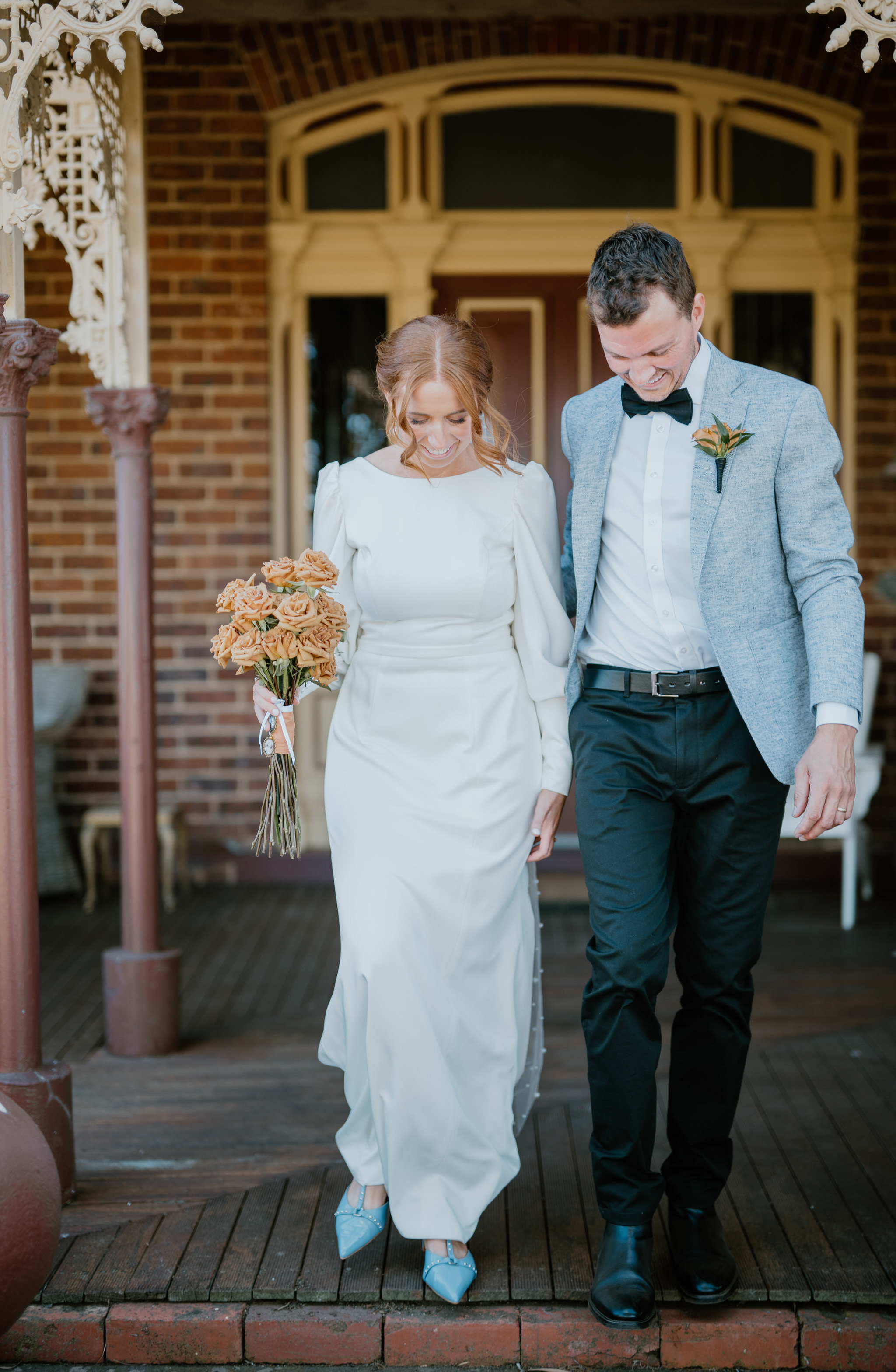 Image two description: Hand in hand, the newlyweds walk down the steps outside a stately venue, beaming at each other. ⁠