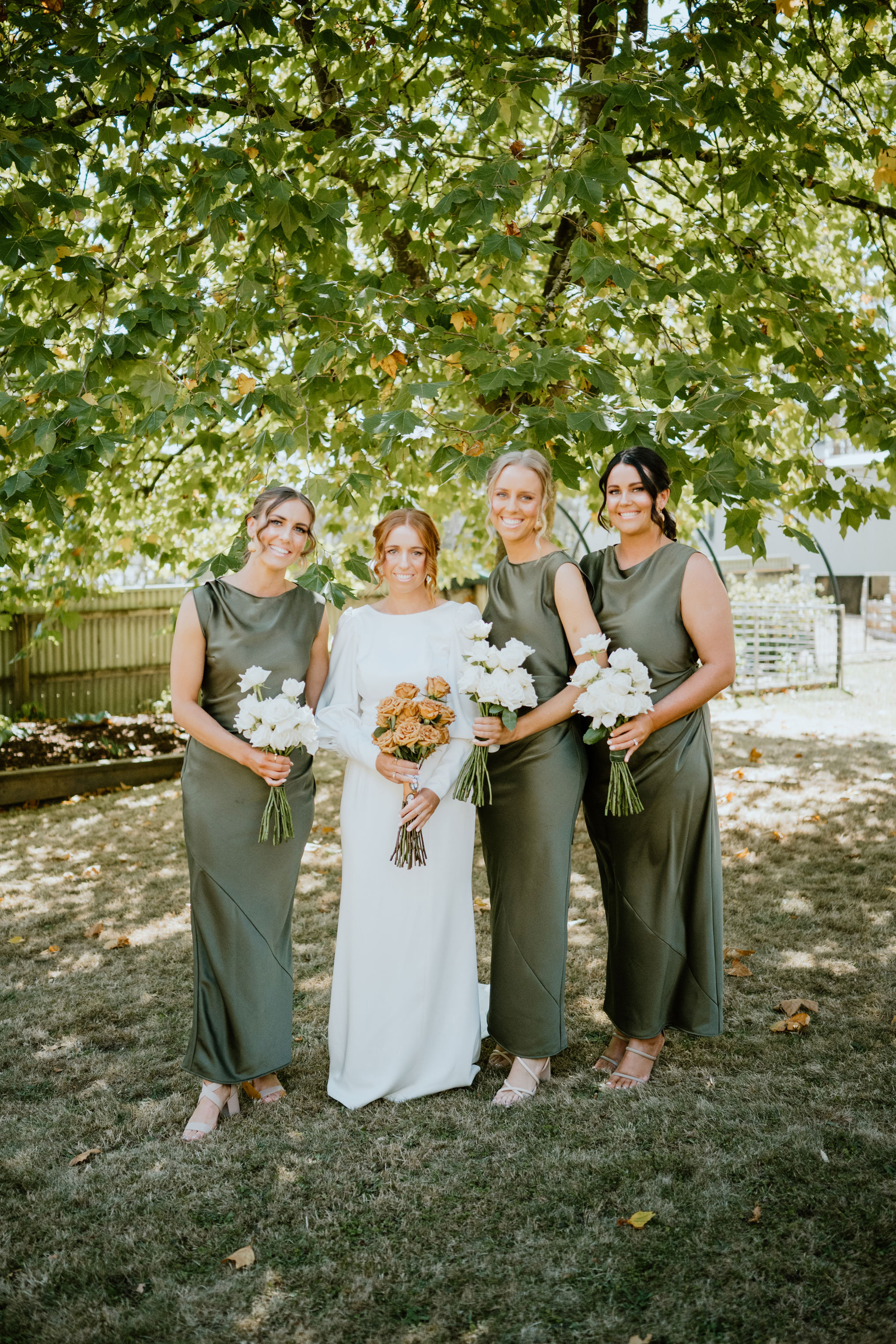 Image two description: The bride and her bridesmaids pose for a shot, wearing dark green silk dresses with white bouquets.⁠
