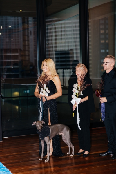 The wedding party was made up of their closest friends, who all wore moody black with their own dazzling twist – including their Whippet Henri in this gorgeous sparkling vest.