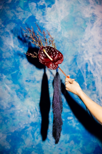 Flowers were kept elegant yet subtle. The women in their wedding party held white orchids with three bows that draped over their hands, while the men carried a single long-stemmed anthurium with a metallic navy fringe.