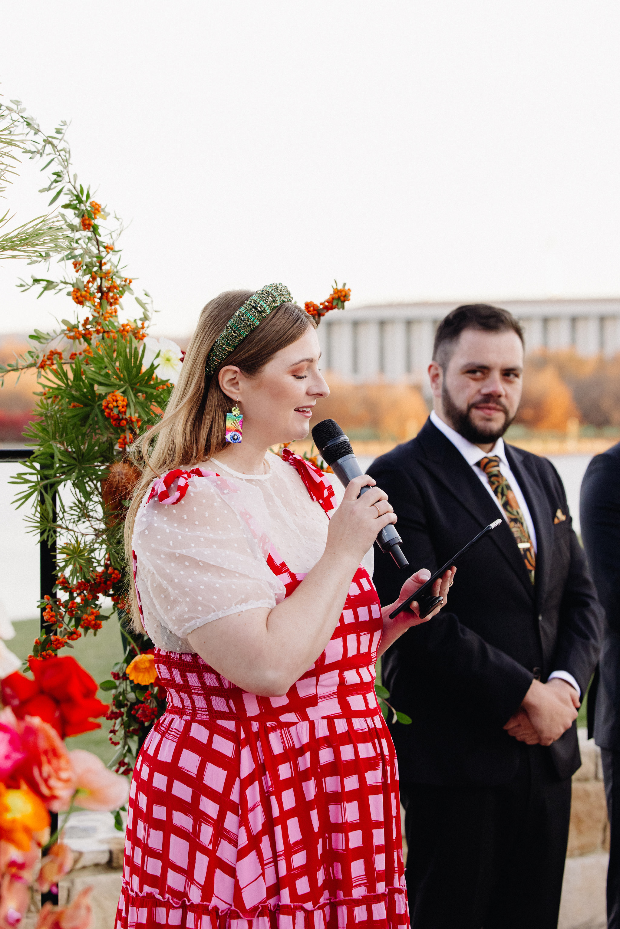 [Image one description: A close-up of a bridesmaid sitting at the ceremony, wearing a textured, rust-coloured dress, holding a bouquet in both hands. The bouquet features soft peach roses, tiny white daisies, deep red textured blooms, and autumn-toned maple leaves in shades of burnt orange and gold. Long orange ribbon trails from the stems. ⁠