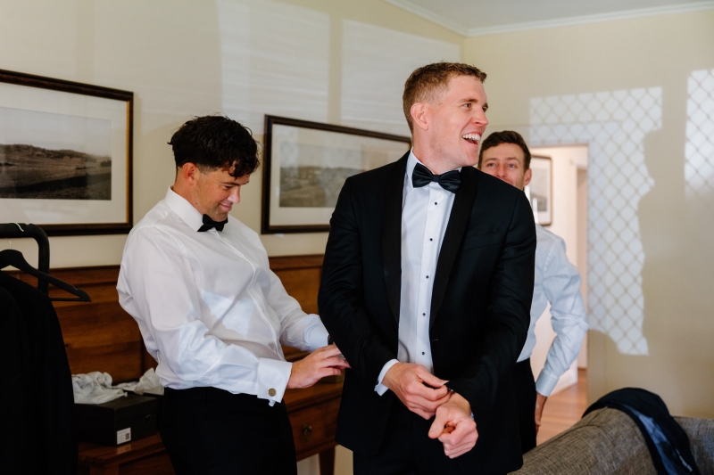 He had five groomsmen, two brothers-in-law and three friends. All of which wore matching black suits from Institchu with a black bow tie. “We also gave them cufflinks with their initials on them as a gift.”