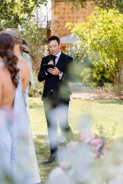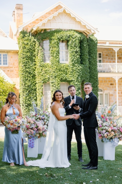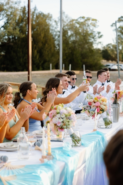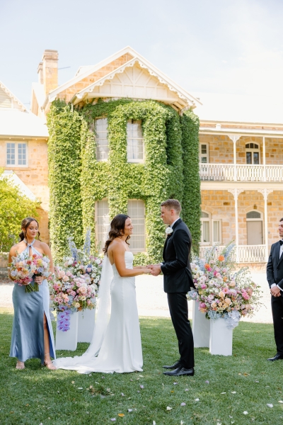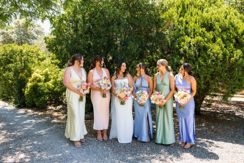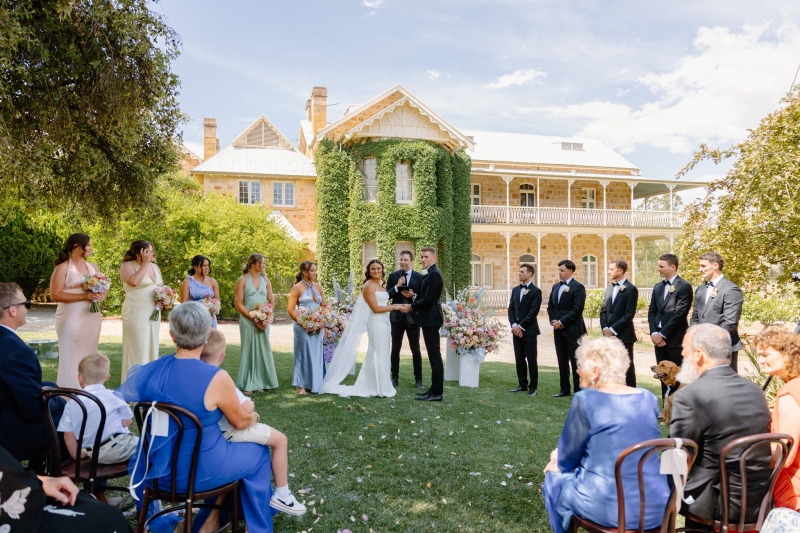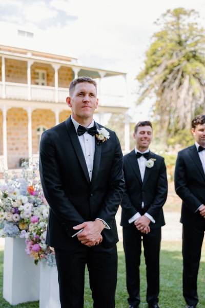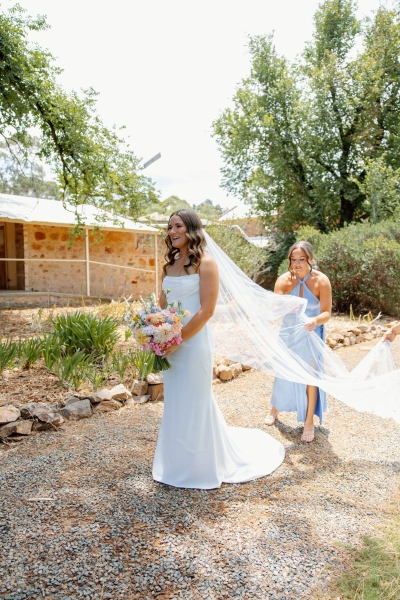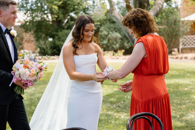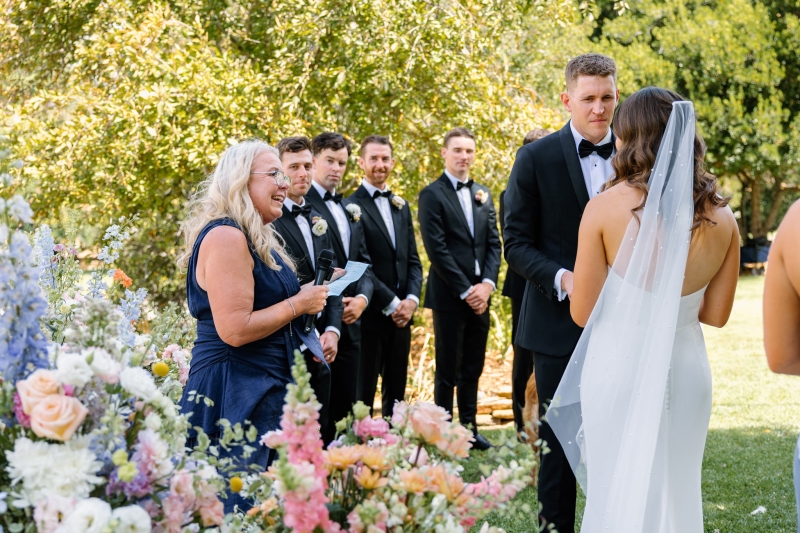 Flowers were provided and created by The Flower Girls SA, featuring a perfect arrangement of pastel, summery tones that perfectly matched the garden aesthetic. “I could not recommend Michelle and her team enough. When she dropped them off, Hannah was in absolute tears about how perfect they were. Hannah spoke and organised all of this with Michelle on the phone leading into the day, and she absolutely nailed the brief. It was also a really hot day, but her team was amazing in making sure that they still looked perfect. We had an assortment of pastel colours for all flowers, including boutiques, the ceremony and reception flowers, and rose petals for the kids to throw down the aisle.”