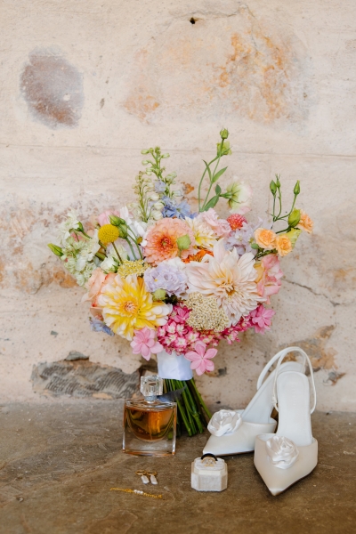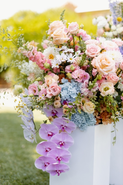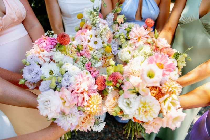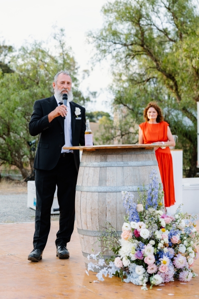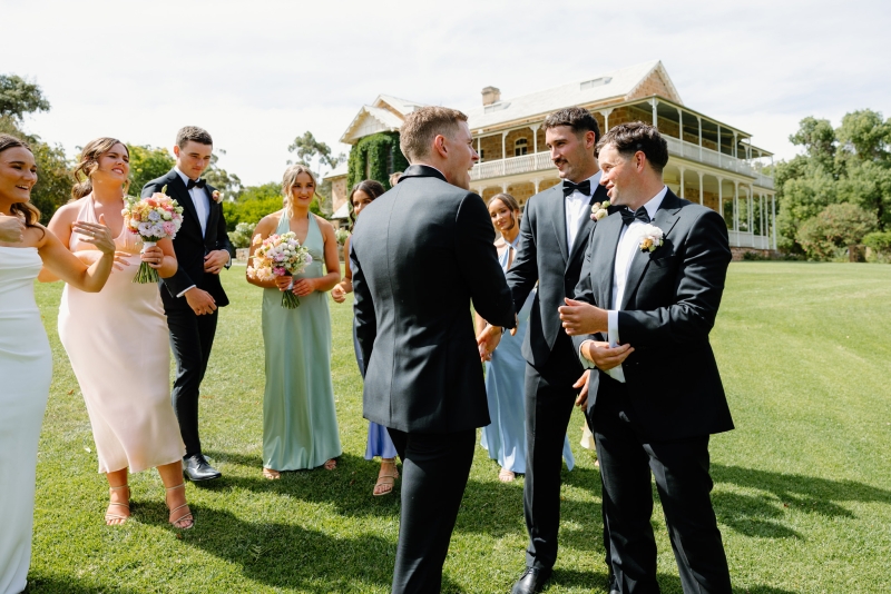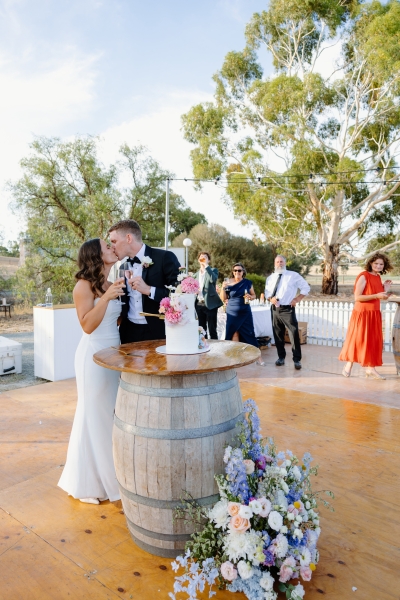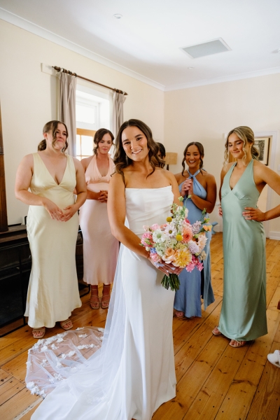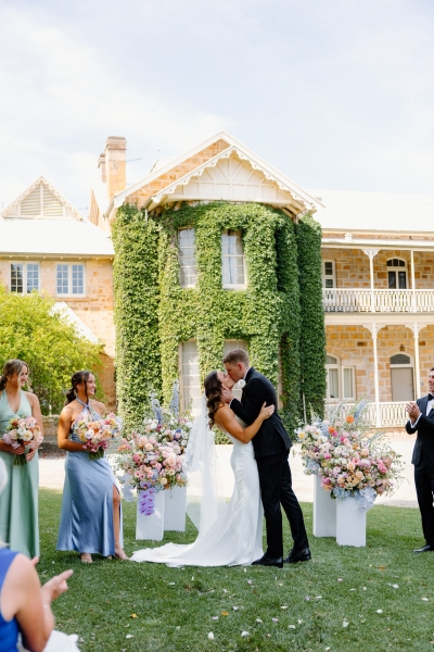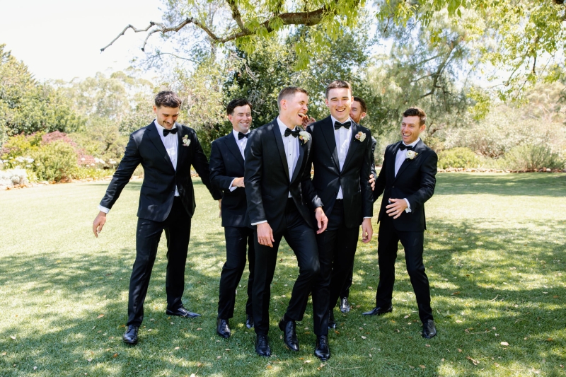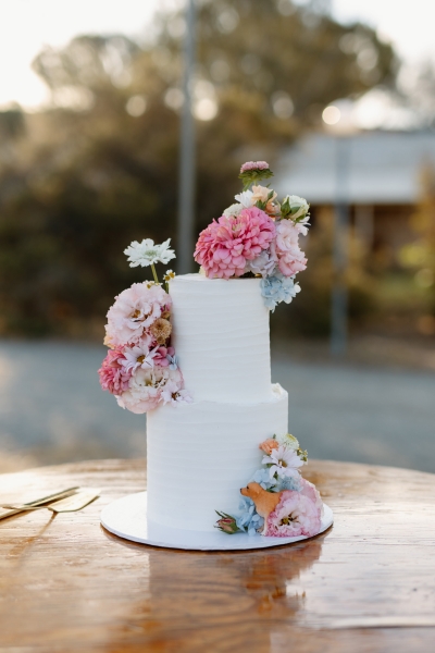 Flowers were provided and created by The Flower Girls SA, featuring a perfect arrangement of pastel, summery tones that perfectly matched the garden aesthetic. “I could not recommend Michelle and her team enough. When she dropped them off, Hannah was in absolute tears about how perfect they were. Hannah spoke and organised all of this with Michelle on the phone leading into the day, and she absolutely nailed the brief. It was also a really hot day, but her team was amazing in making sure that they still looked perfect. We had an assortment of pastel colours for all flowers, including boutiques, the ceremony and reception flowers, and rose petals for the kids to throw down the aisle.”