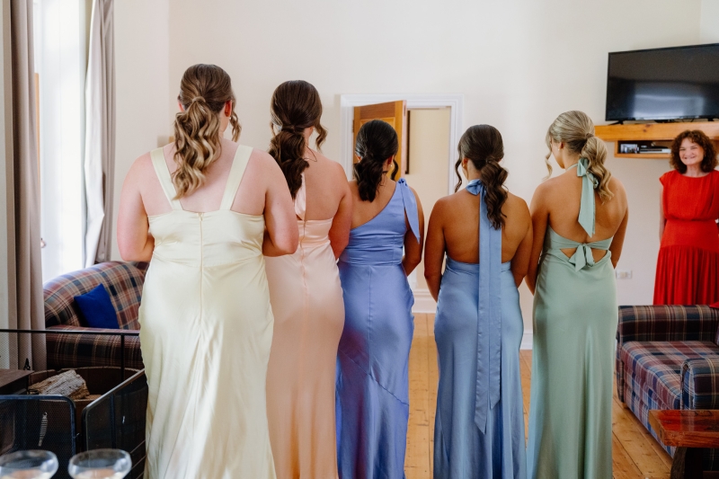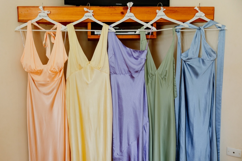 In her own wedding party, Hannah had her two sisters, two sisters-in-law and a friend. Each wore a different colour and style of satin dress. “I loved them in something they felt comfortable and confident in, but still matched the theme and made it look cohesive.”