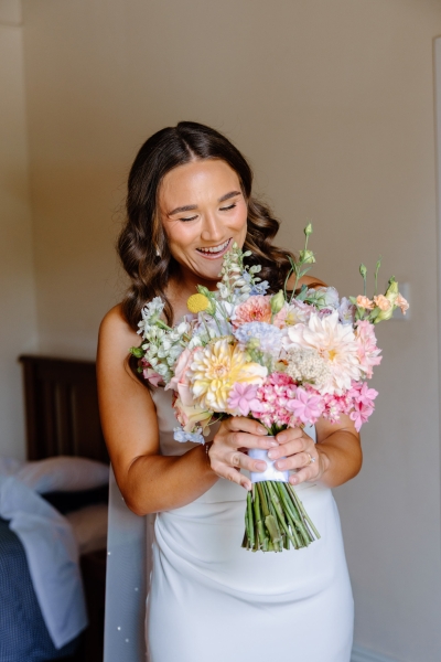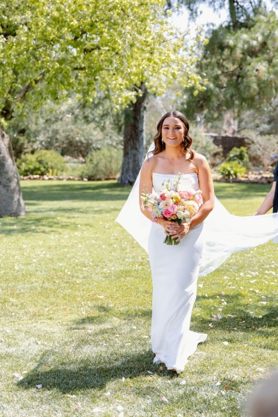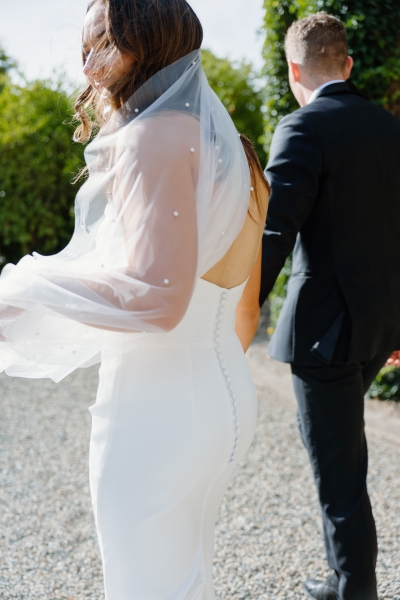 Hannah also went with a classic choice, a beautiful strapless Kyha from The Bride Lab gown. “I wanted a timeless dress that was elegant but wouldn’t date, and something that I could be comfortable in and dance in later! It has ruching down the front, I had button details added down the back, and my veil was a combination of flowers and pearls. My shoes were a satin sling-back pointed-toe heel with a rose on the front that you could see poke through the bottom of my dress.”