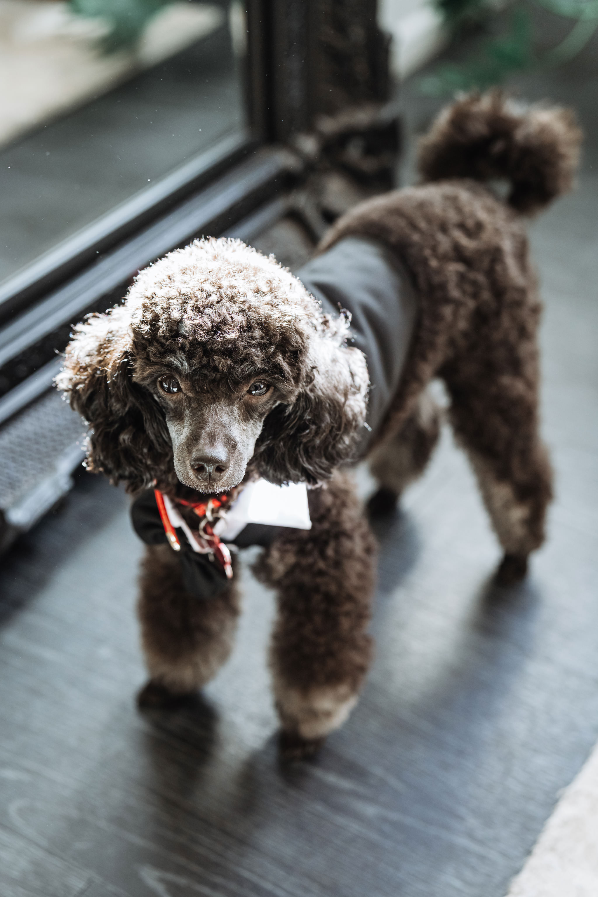 Image two description: A groom in a cream suit smiles warmly as he holds a black toy poodle wearing a red bow collar.⁠