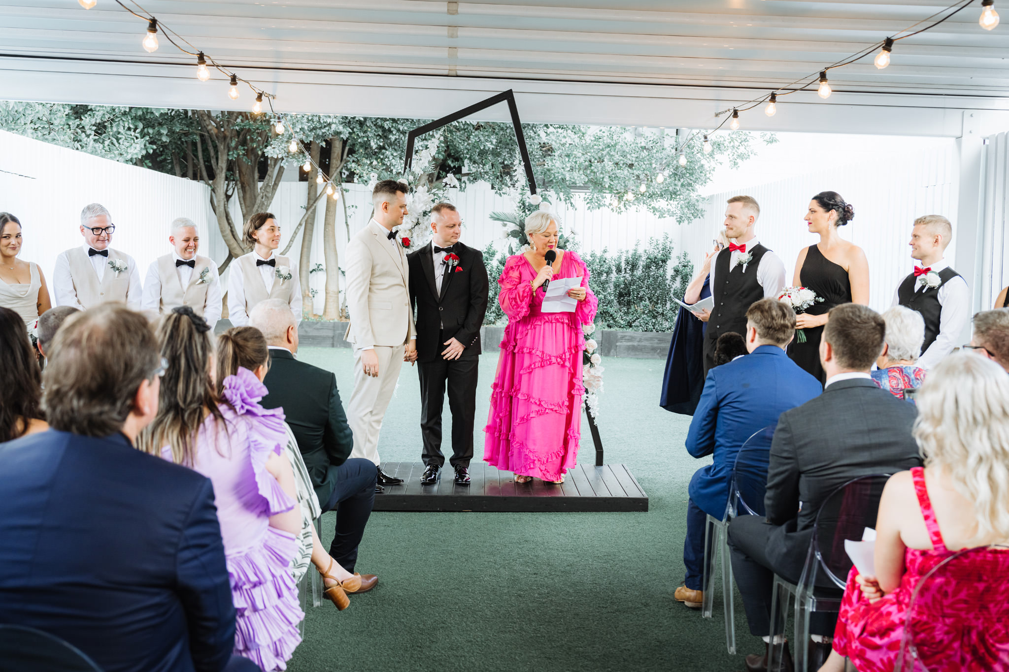 Photographer: @sorosiewedding / Ceremony Officiant: @happyeverlaughterceremonies / Venue: @therefinery__ / Wedding Cake: @confetticakeco_ / Lighting: @brisbanefairylights / Flowers: @perfectpetalsflorist⁠