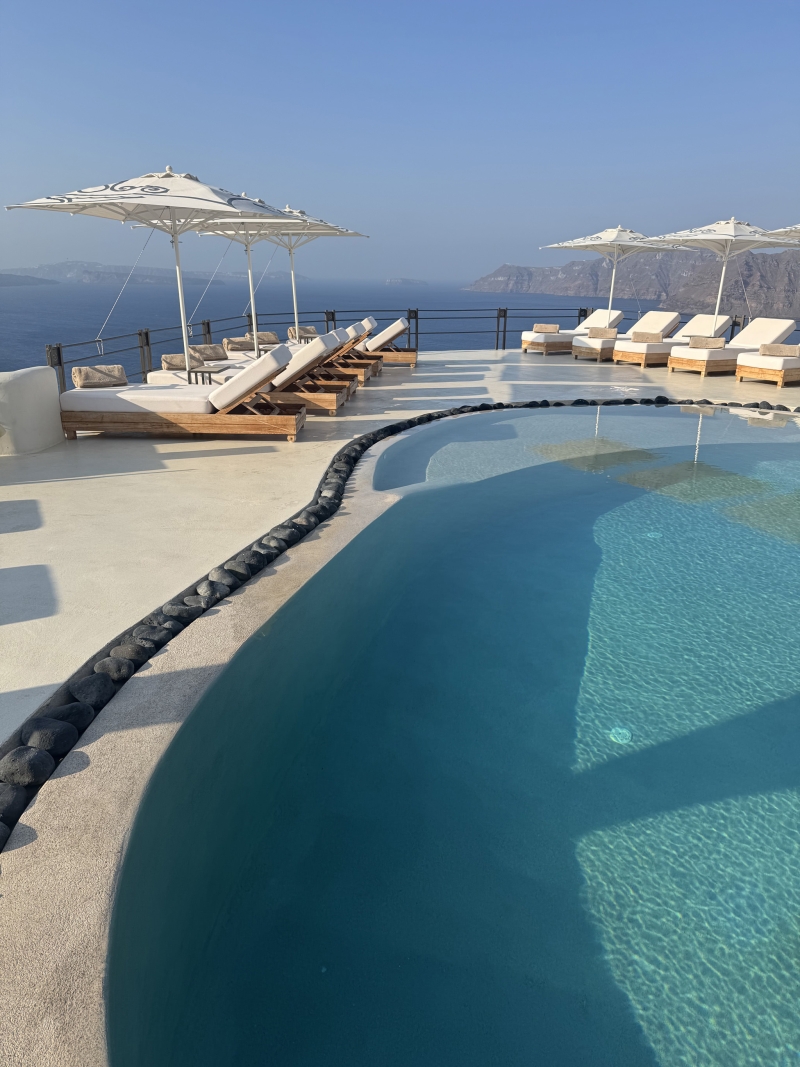 If you want to go to Santorini, you’ve day dreamed about swimming in a pool on the Caldera. We’ve all seen the photos. It’s just part of the ‘Santorini’ package but for a lot of us, it’s not attainable. When we booked into the Andronis Arcadia, I knew we wouldn’t be staying on the Caldera. We had an amazing plunge pool and Santorini’s biggest hotel pool. SO much pool. But it turns out, when you stay at an Andronis property, you have access to the facilities at the other Santorini Andronis properties. We spent a blissful morning pool hopping at the Andronis Boutique Hotel. The adults only hotel sprawls down the caldera hillside. The heated pool and deep plunge pool are so close to the caldera, we might as well have been swimming in the sea.