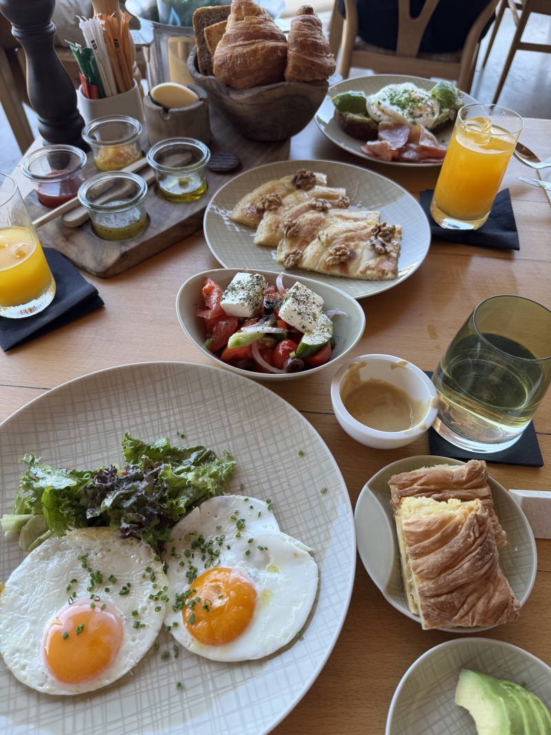 This is Greece, where the days start late and the nights go long. Breakfast at Pacman starts at 7.30am but goes until 11am and the menu reflects that. Embracing the European schedule, we arrive at 10am and start off at the Greek yoghurt bar, drizzling tahini and peanut butter, local honey and fresh fruit into our bowls. We then try traditional crepes served with walnuts, before diving into a selection of small dishes of Greek salad, oregano fries, cheese pies and fried eggs, that sets us up well into the day. There’s plenty of traditional dishes like Eggs Benedict, avocado on toast and omelettes, but I’m here for the Greek pastries all day every day.