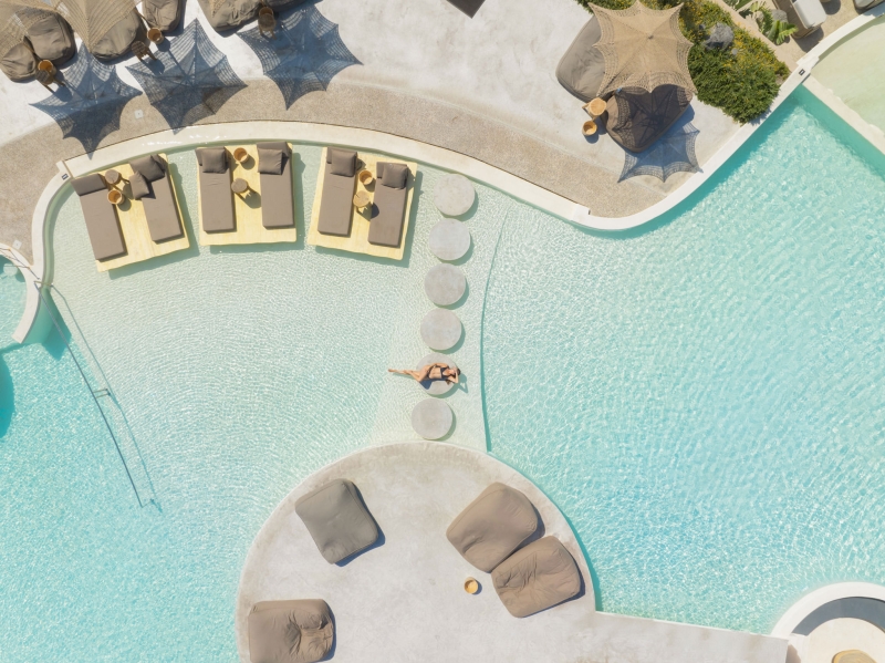 There are plenty of bougainvillea and white-washed buildings at the Andronis Arcadia, but our suite is a study in polished concrete and rattan. The aesthetic is distinctly earthy and simple. It’s a more modern take that matches the dark rocks of the island itself. We hide away in our plunge pool in the afternoons, under our rattan sun umbrella sipping chilled wine as we wait for sunset.