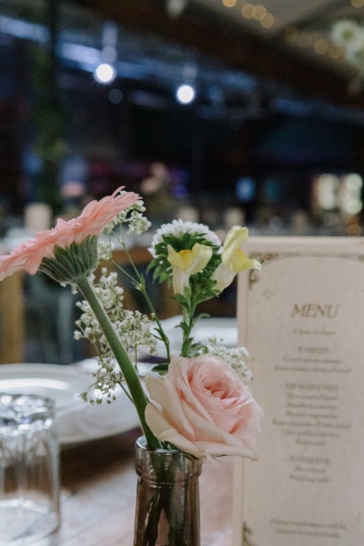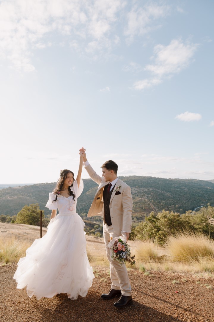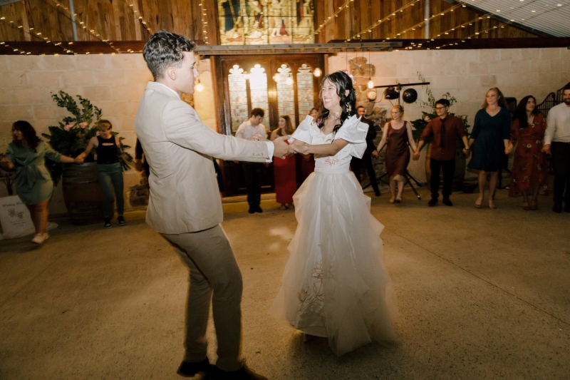 They made considered choices with their wedding attire. Gwendolyn wore a sustainably sourced Chinese Tea Ceremony dress while Alexio wore a suit he already owned. Gwendolyn’s wedding dress was Alexio’s mum’s wedding dress, which Gwendolyn added to with an overskirt purchased secondhand and altered with floral appliques made from repurposed fabrics. Her earrings were handmade, and her necklace was upcycled from thrifted jewellery. Alexio’s ceremony suit was made from linen, and he plans to rewear to other events. And Gwendolyn’s post-reception dance floor dress was her year 12 ball gown upcycled with additional pieces (from an old wedding veil and lace curtains!).
