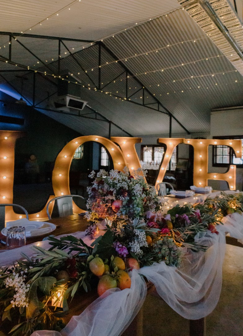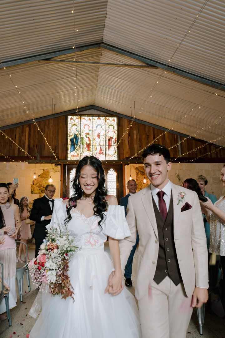 The wedding was held at The Church Barn at Chapel Farm Estate in Middle Swan, Western Australia. They chose the beautiful venue, made from repurposed and recycled materials, because it was a venue that required little decorating. The venue provided fairy lights, greenery and furniture, which meant the couple didn’t have to add much that would go to waste after the wedding.