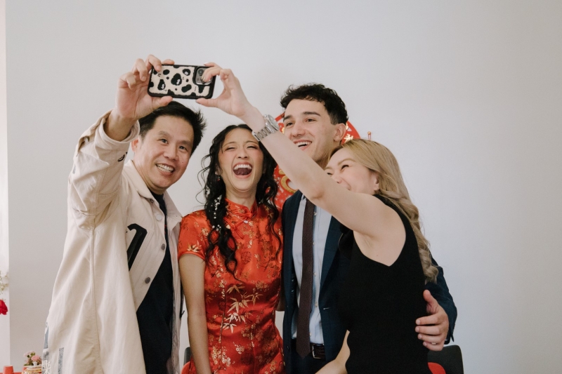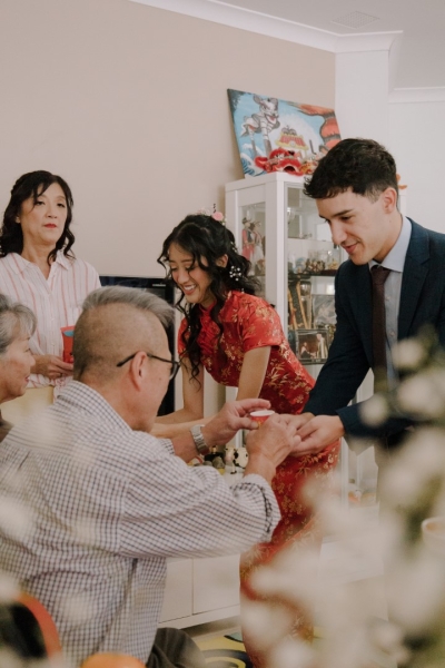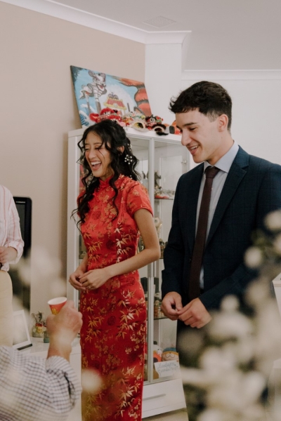 Our wedding day was long. My day started with hair and makeup from 6 am for myself, my bridesmaid, my mum, and my mother-in-law. At 10 am, the groom and his family arrived, and my bridesmaid played some pranks and games on him before letting him into the house to see me. This is a part of traditional Chinese weddings called the “Gate crash games” or “Door games,” where the groom and his party have to face several challenges to prove that he is worthy and devoted to marrying the bride. One of the typical challenges involves the groom eating a series of things that are “suan, tian, ku, la”, meaning “sour, sweet, bitter, spicy”, which represents the ups and downs of marriage. Once all challenges were overcome, Alexio was able to finally meet me.