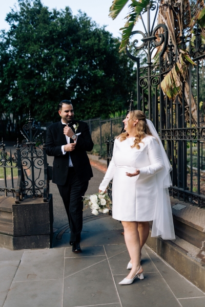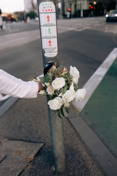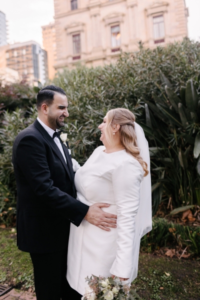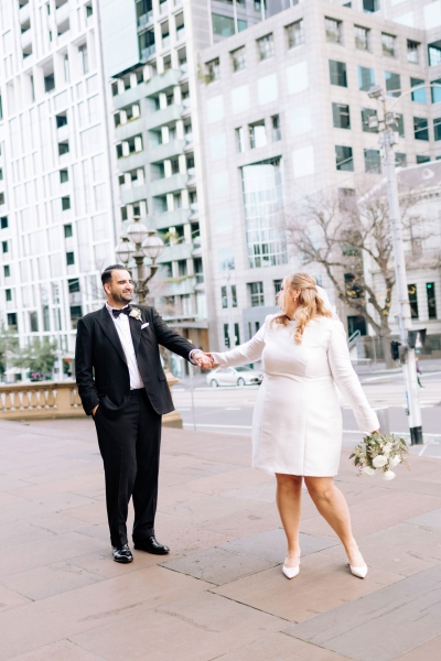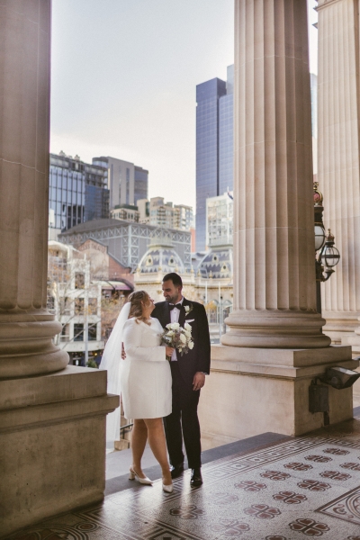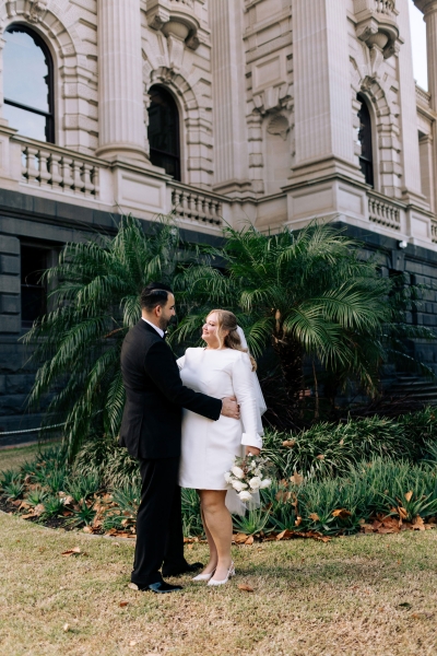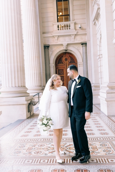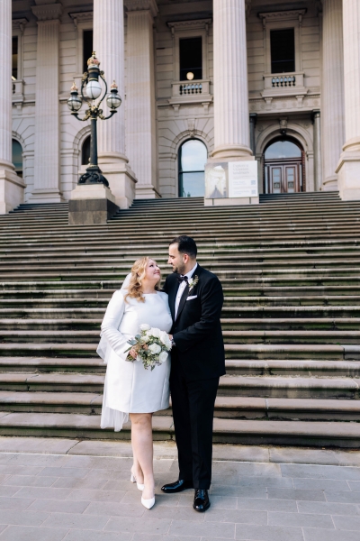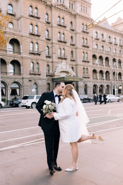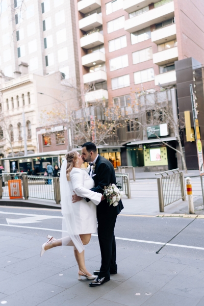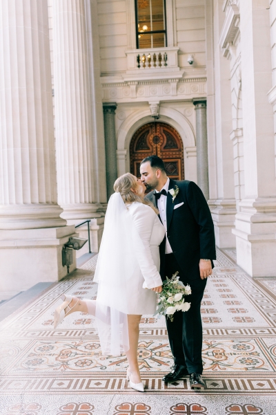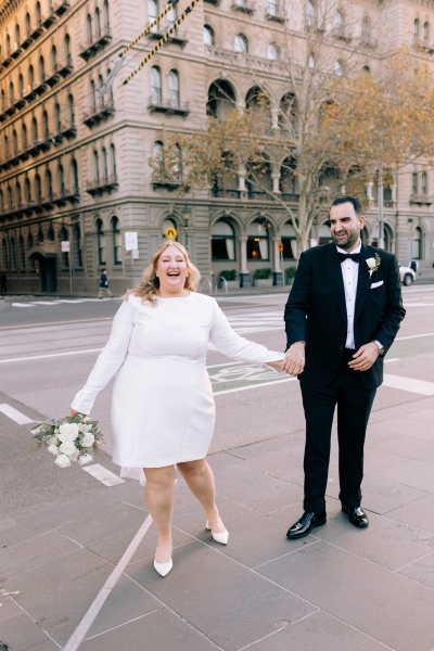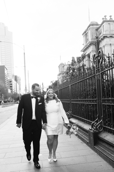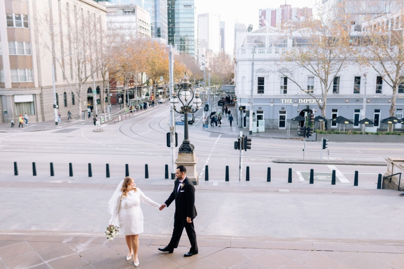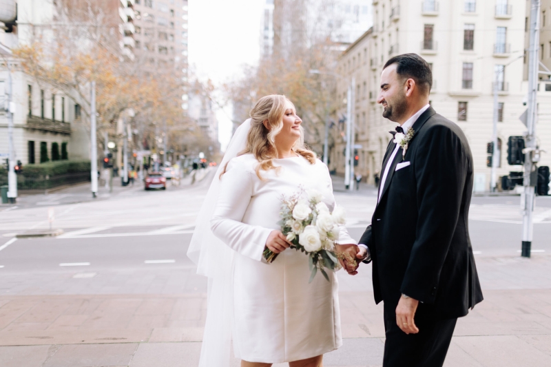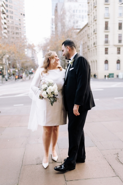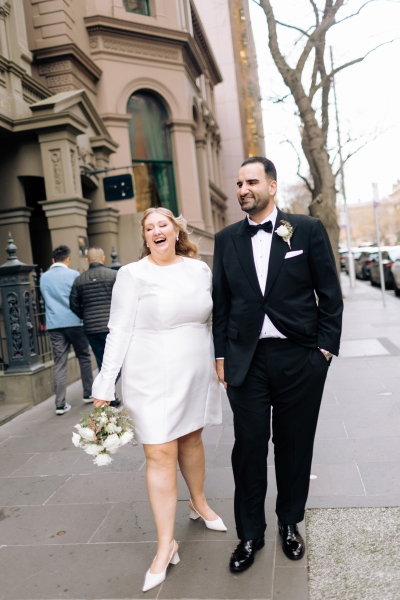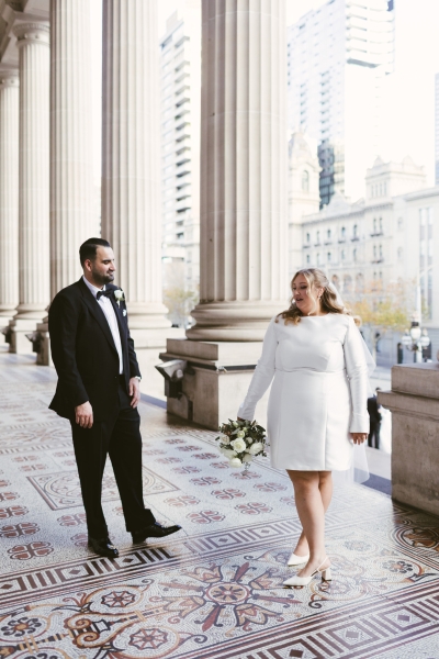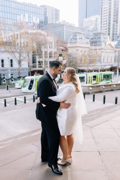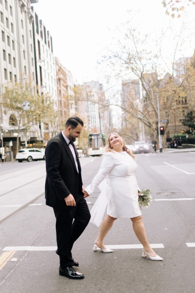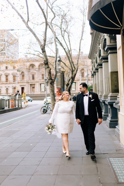 One of their main goals for the elopement was to feature Melbourne as much as possible, as it’s where both Larissa and Houman have chosen to live, away from their families. “I just didn’t realise at the time how much Melbourne would love us back! We had the 4 pm slot on a Friday and spent around two hours walking from different photo locations around the Paris end of Collins after 4:30 pm. Everyone we walked past congratulated us, people were woo-ing out the windows of passing cars, giving us standing ovations outside pubs and trams full of people were cheering while the driver rang the bell over and over for us. It was such a beautiful feeling and really added to how special and fun our day was!”
