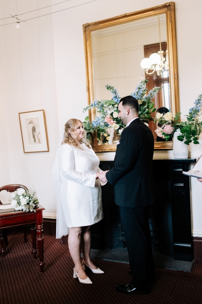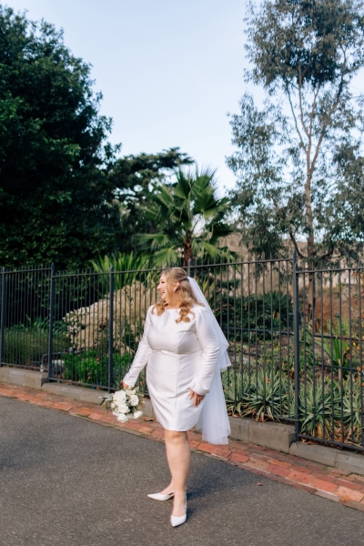 As any Melbournian knows, in winter sleeves are a MUST! As Larissa began her search for the dress, she knew she wanted something with long sleeves but a shorter hemline. “I didn’t want the dress to be long either, as I was worried it would swallow me up. I did a whole heap of digging around on Pinterest to find inspo and came across Clem Bridal in Sydney. They had exactly what I was looking for! Something that cinched my waist was very structured and warm, with long sleeves and hitting just above the knee. I emailed them my measurements, and they custom-made a dress for me in a month! The insane part is that we only decided to get married eight weeks before the date, so I was a little stressed. The dress arrived and fit like a glove, and only needed a hemline lift. I was so lucky and couldn’t be happier with it!” she explained.