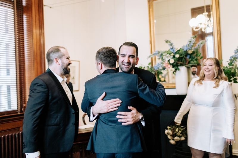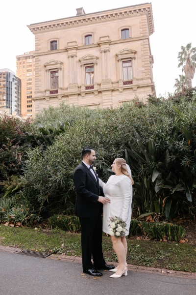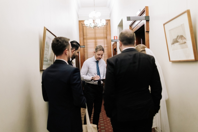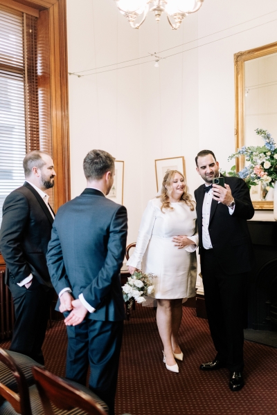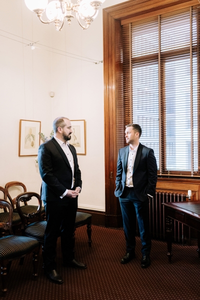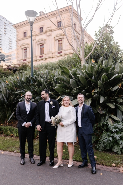 As their only two guests and witnesses, the couple asked their closest friends (James and Andrew) to join them. “Both of our families are spread across Australian and international cities, so when we made the decision to elope, we knew none of our family would be in attendance. James and Andrew are the people we wanted to witness the ceremony and have a fun & bougie dinner with afterwards. They wore suits to the ceremony, too, which was so nice. We all looked so good together!”