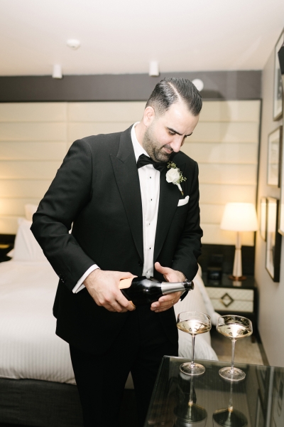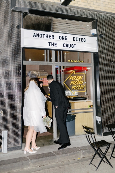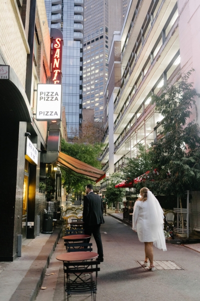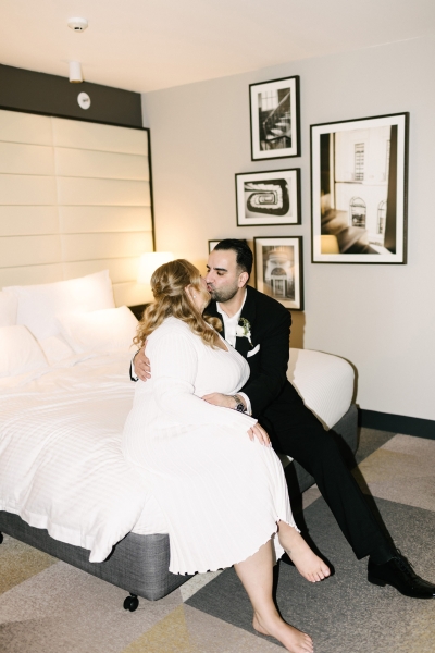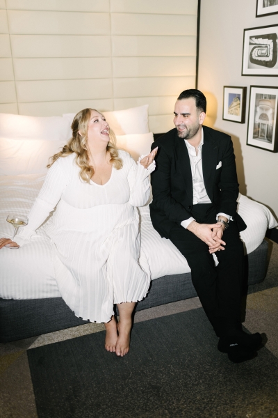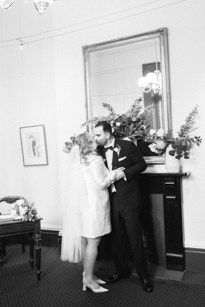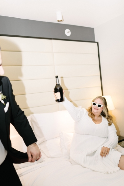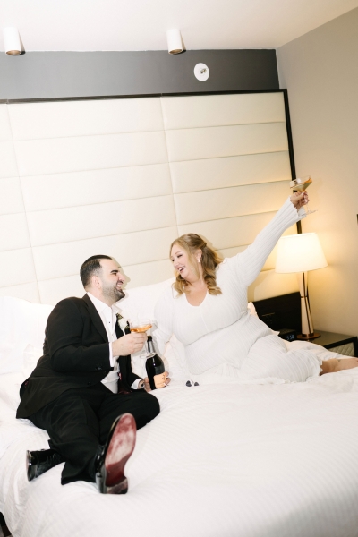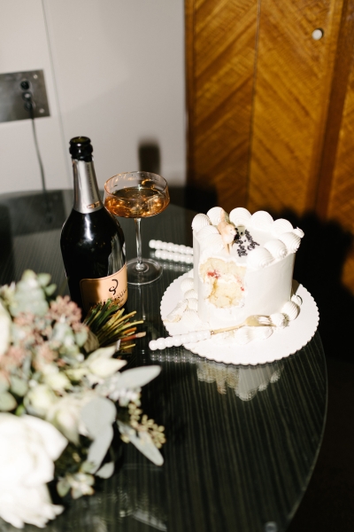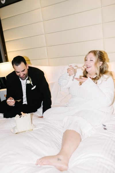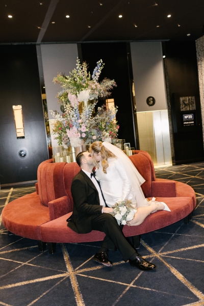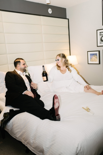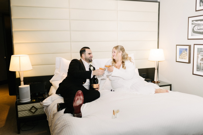 Their ceremony at the Victorian Marriage Registry was only a mere formality, opting for the standard vows and no readings. “I know this won’t be a popular opinion, but it’s how we felt. We knew the ceremony would only take around 15 minutes, so it was probably the least important part of the day for us. We were much more interested in taking beautiful photos, having a drink, eating a slice of pizza and enjoying champagne in our room. I will say that after our photographer finished, we read very long, personal vows to each other that we had prepared. It was just the two of us, crying in bed, recalling our loveliest memories and professing our deep love for each other over champagne and cake. It was kind of perfect!”