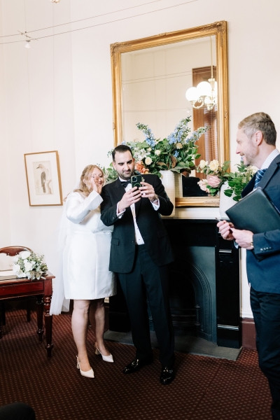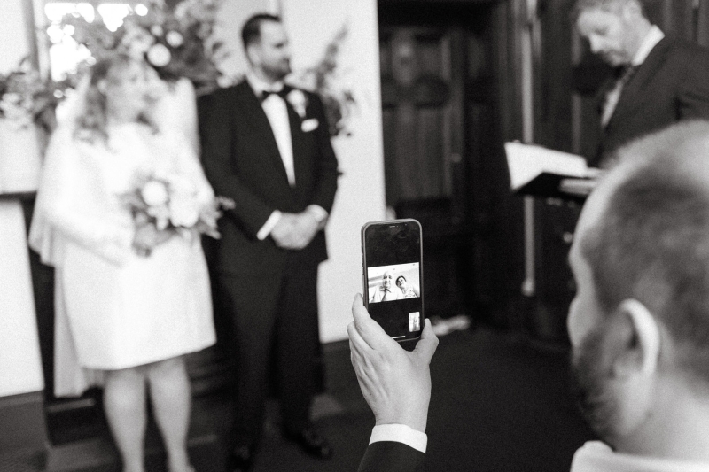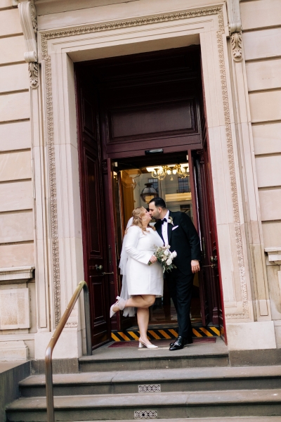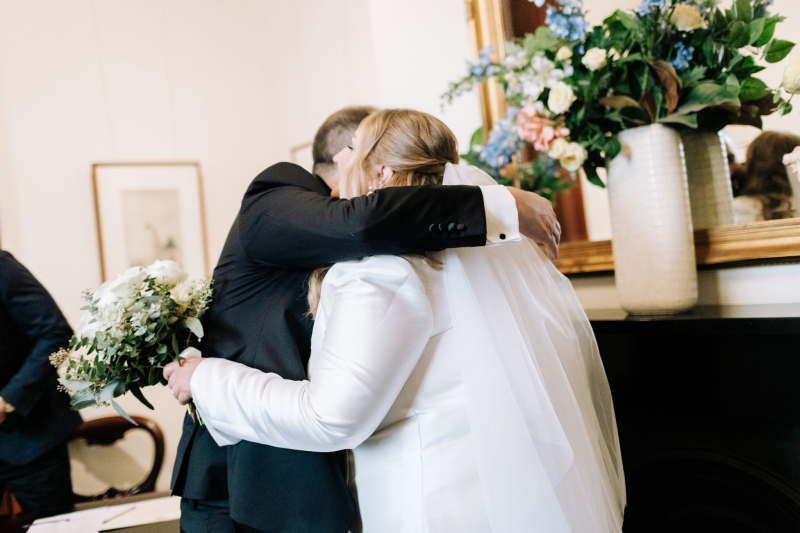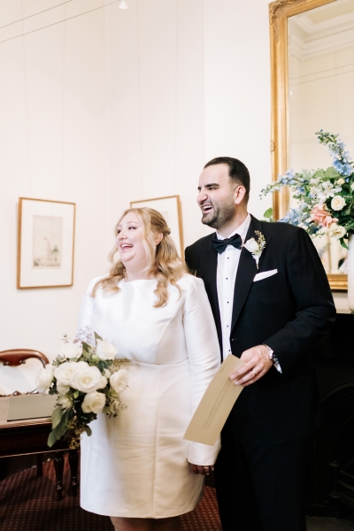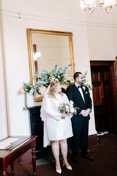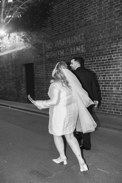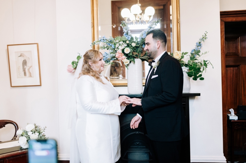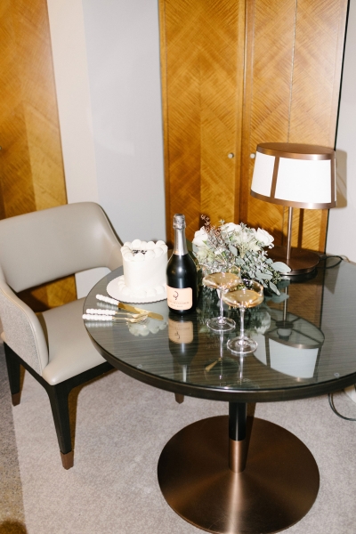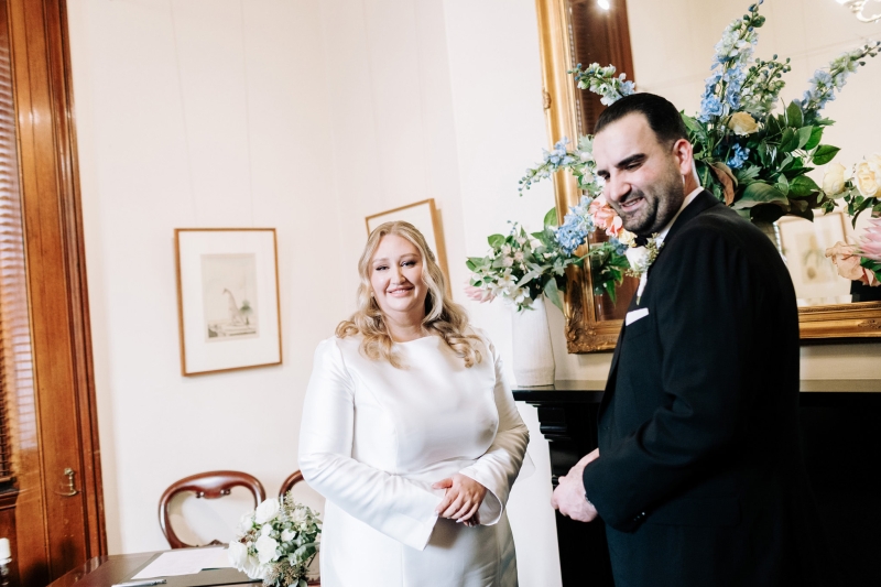 Their ceremony at the Victorian Marriage Registry was only a mere formality, opting for the standard vows and no readings. “I know this won’t be a popular opinion, but it’s how we felt. We knew the ceremony would only take around 15 minutes, so it was probably the least important part of the day for us. We were much more interested in taking beautiful photos, having a drink, eating a slice of pizza and enjoying champagne in our room. I will say that after our photographer finished, we read very long, personal vows to each other that we had prepared. It was just the two of us, crying in bed, recalling our loveliest memories and professing our deep love for each other over champagne and cake. It was kind of perfect!”