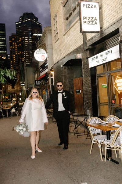 Instead of the ceremony taking centre stage, Houman and Larissa wanted to focus on their favourite locations across Melbourne. “The day was more about the best locations to get photos taken that matched the vibe we wanted. In the end, we went with 1806 for the bar photos, Pizza Pizza Pizza for the fun photos, and then back to our room at the Sofitel for cake and champagne. This felt really true to us and was so, so much fun!”
