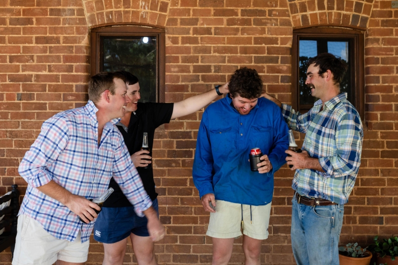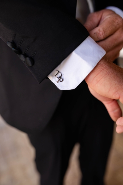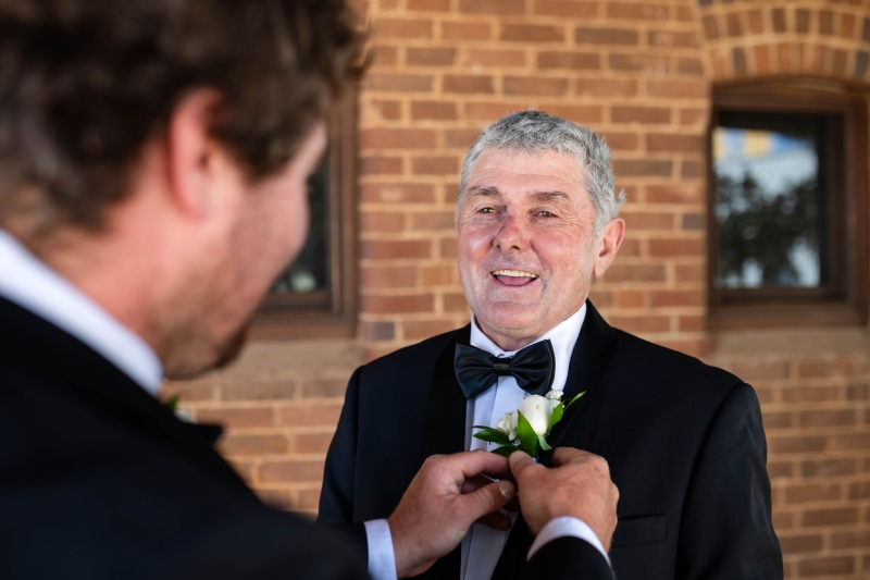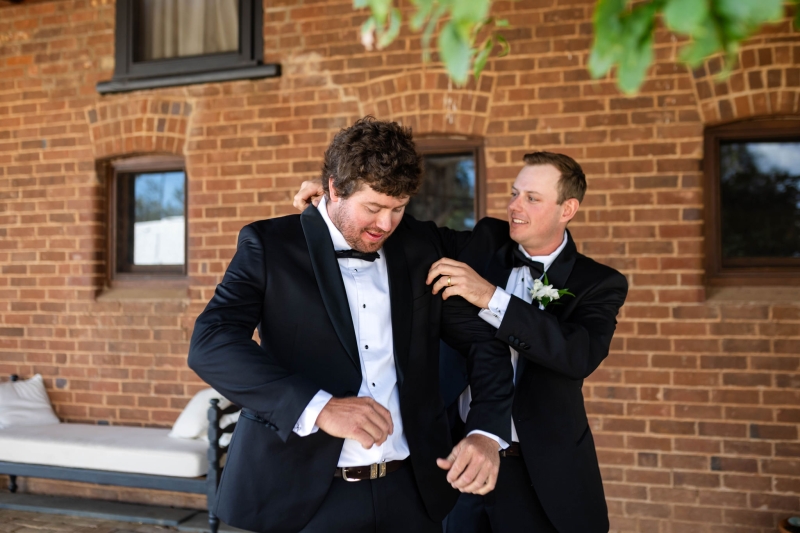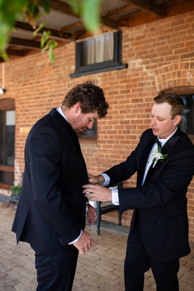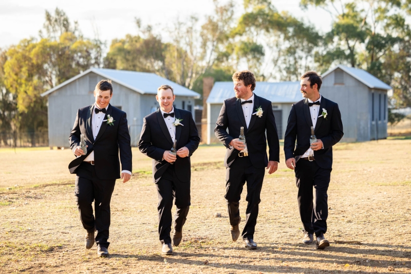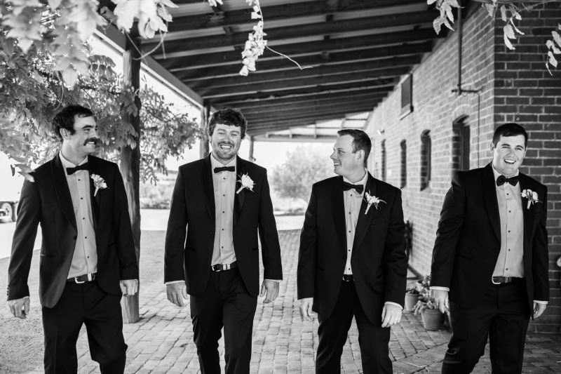 Dom and his groomsmen have a tradition of re-wearing their tuxedos for each other’s weddings, so it came as no surprise when they did the same for his and Angie’s day (and for another wedding a few months later!). A simple black tux from Blowes Clothing, paired with his R.M. Williams boots and belt – classic.