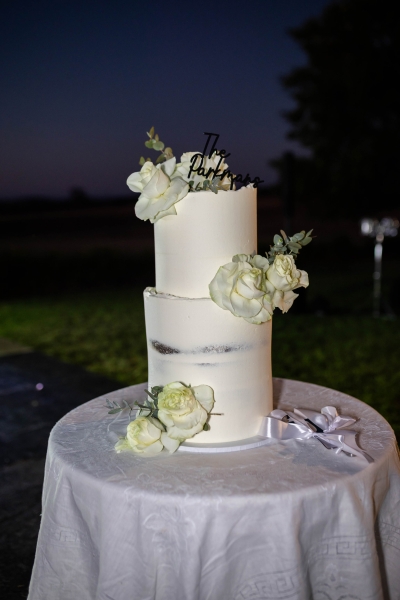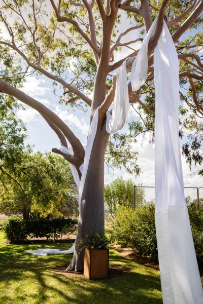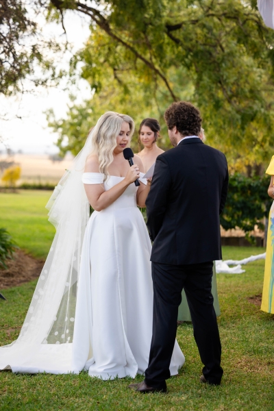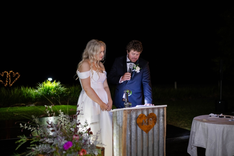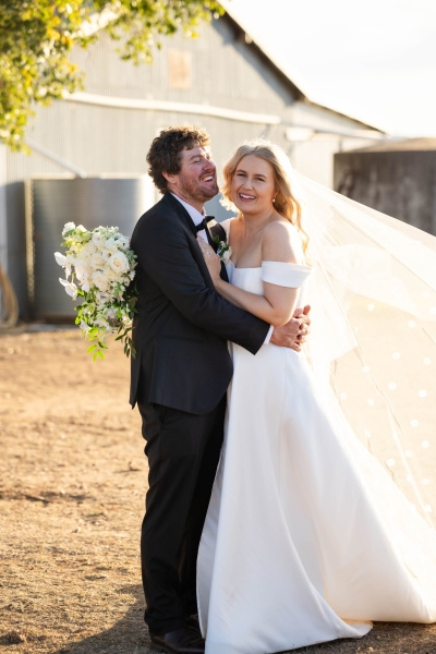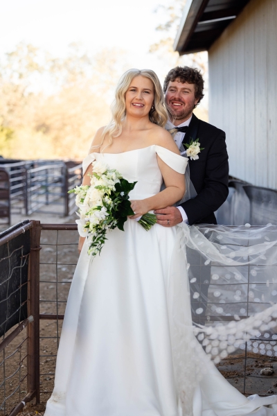 Their ceremony took place in the garden next to the homestead they live in on the family farm, with rows of white chairs and the garden draped in satin.