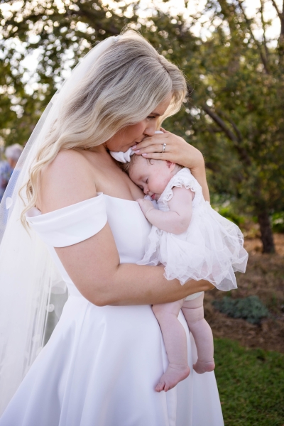 For Angie, her favourite photo has to be this one of their daughter asleep on her chest as she and Dom have a quiet moment after the ceremony.