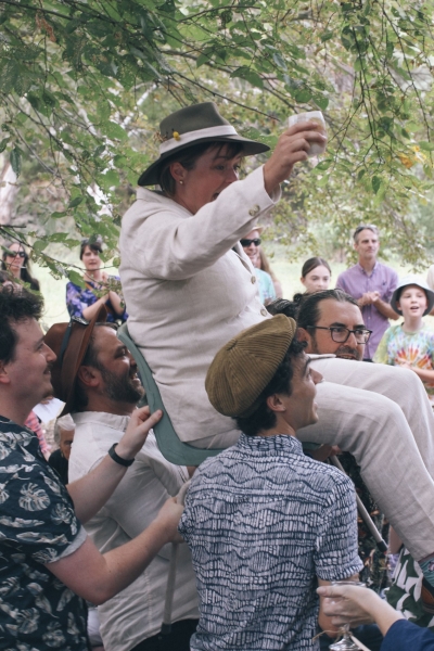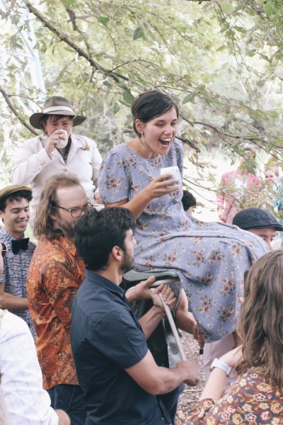 At the end of the ceremony, their friends created a custom vow to Emily and Michaela. They then hoisted the surprised but delighted couple up onto chairs and to a chorus of cheers and song, they were carried into married life.