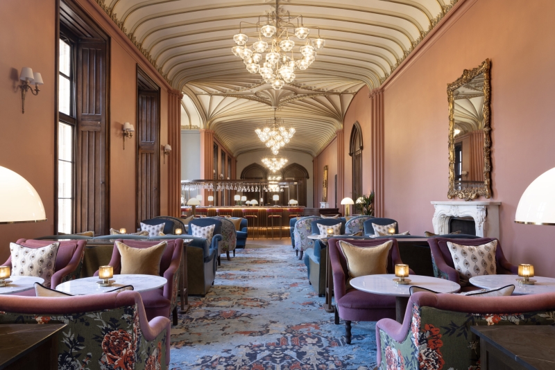 Manicured woodlands and a grand driveway set a misleading scene for Cromlix. At first glance, it looks like a classic Victorian era country estate – like the many dotted around Scottish townships outside Edinburgh. But then, you walk through the front door and spot the bright pink lounge chairs and dramatic dark floral curtains. You head into the drawing room and there’s mustard yellow couches mixed with green armchairs, and mint walls with a yellow ceiling. There are fabulous floral cushions, glass floor lamps and so many layers of patterns on the furniture, rugs and curtains that complement each other just so.