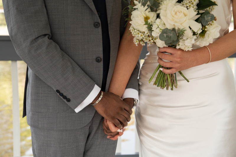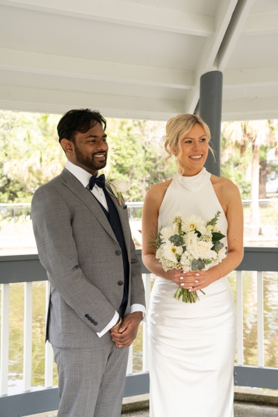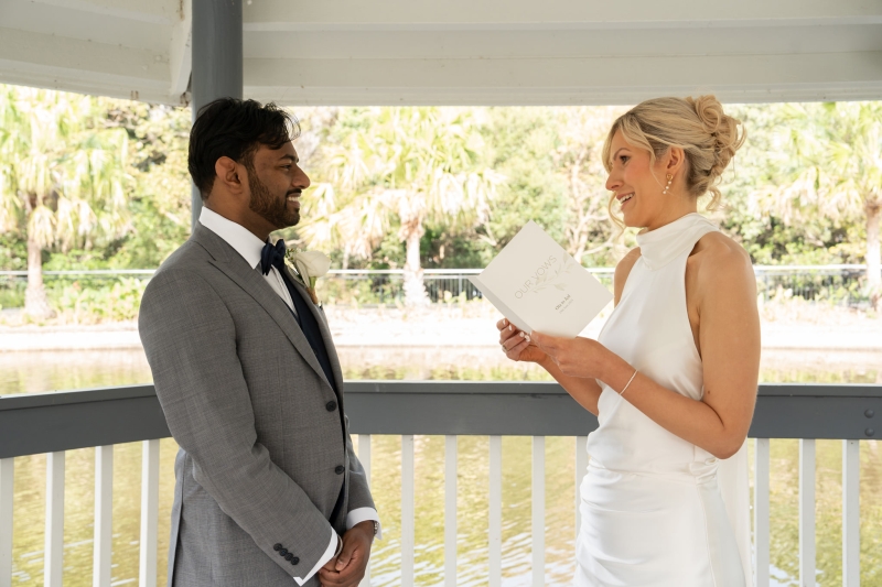 She walked towards the rotunda in the gardens to Canon in D by Pachelbel. “Although it was winter, the day was wonderfully warm and sunny. As we faced each other exchanging our vows, the ceiling of the rotunda, our flowers, and all of us inside were lit up by dancing rays of sunshine reflected off the water. It was a truly tranquil and magical moment.”