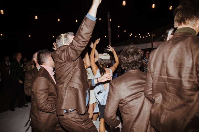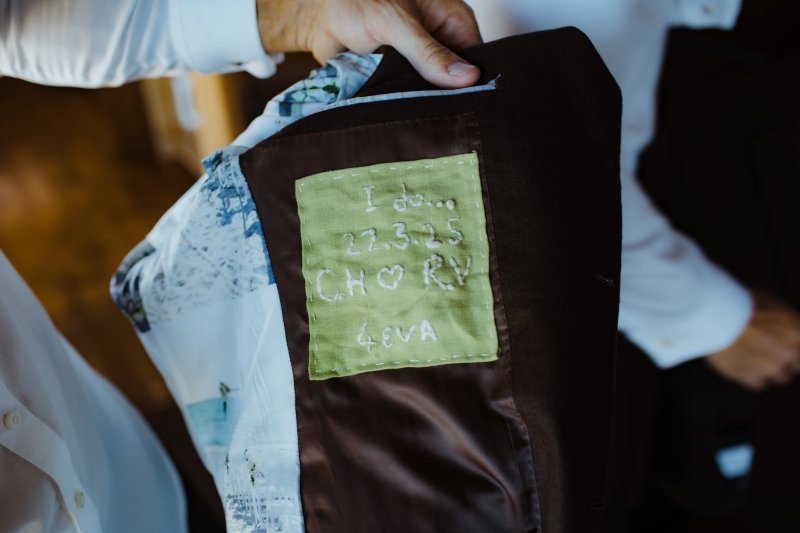 His wedding party wore matching brown linen suits and a white shirt they already owned, with Caroline adding embroidered initials and dates to all of their jackets.