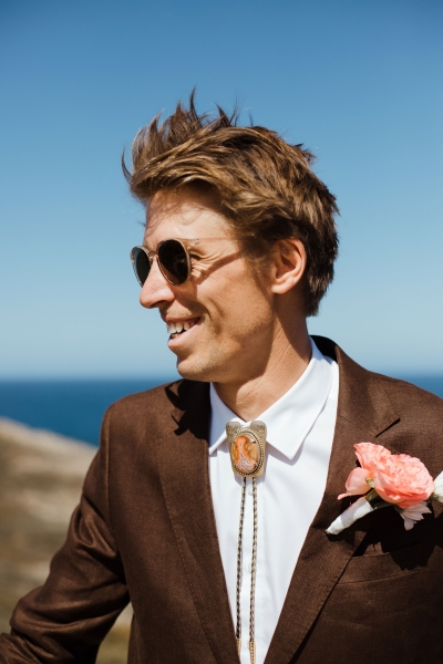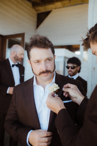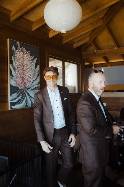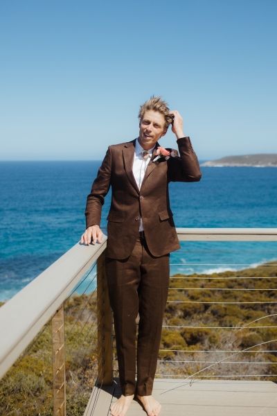 For the first section of the day, Rohan chose to wear a 60s-inspired chocolate brown linen suit with a bolo tie (found at a vintage market – score!), paired with a white shirt and brown R.M. Williams boots. “I embroidered a little note on the inside of the jacket with wool which had been spun by a lovely local lady and friend, Vicki, using sheep’s wool from our own farm!”